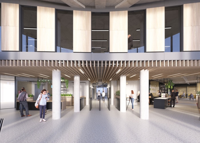 Internally, the proposals include completely reconfiguring the existing entrance and reception area to include a new tenant hub with coffee bar offer. Below ground, a level of the basement car park will be converted into a new office floor, reconfiguring the atrium and dropping the floor down a level. At roof level the top floor office has been extended and two new roof terraces created. The atrium was reconfigured to respond better to daylight analysis and new core provides additional lifts and gender neutral toilets.
