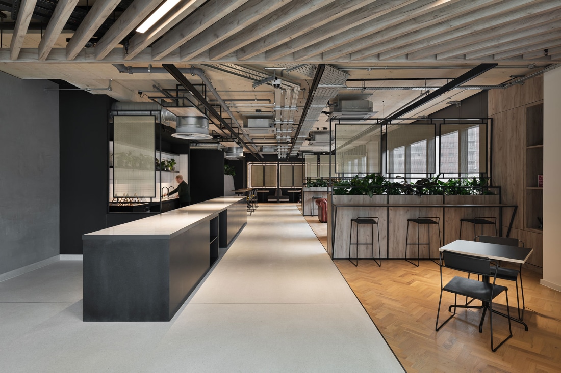 The sophisticated and understated style is given an ‘edge’ through the palette of exposed concrete, poured concrete flooring, raw polished plaster, natural materials and air purifying plants.