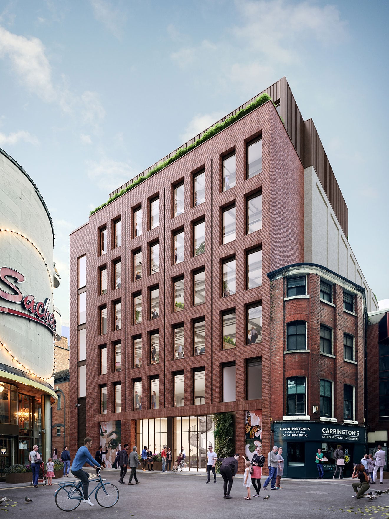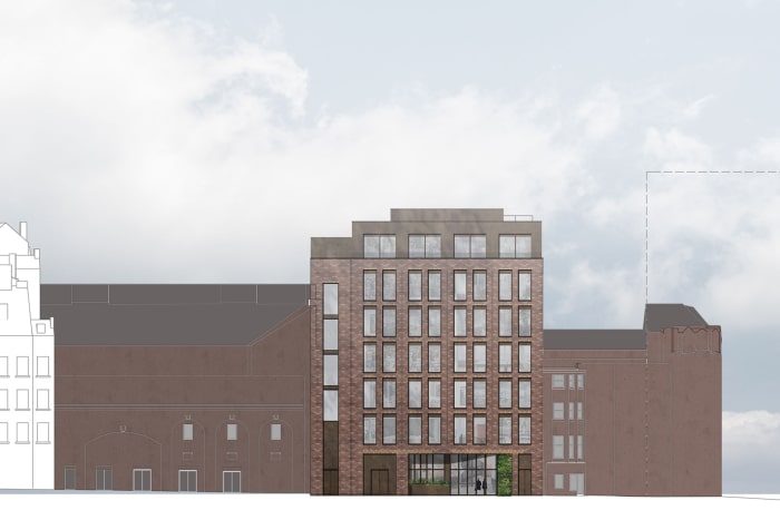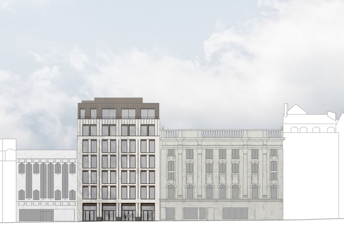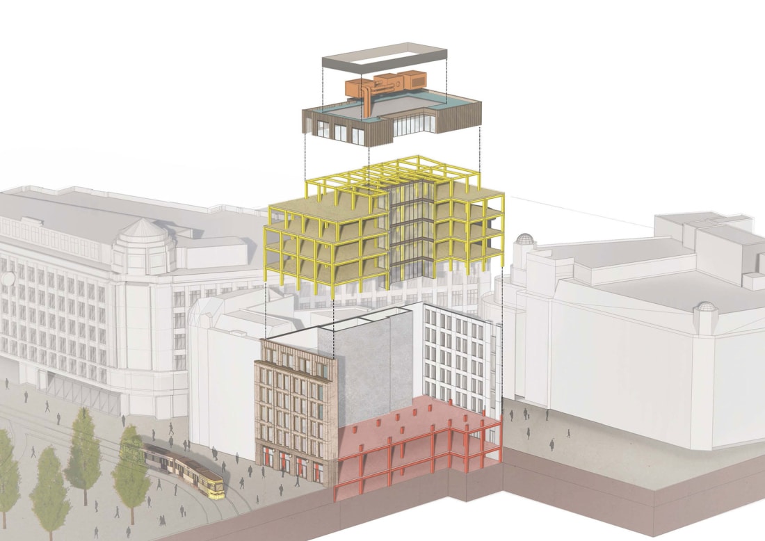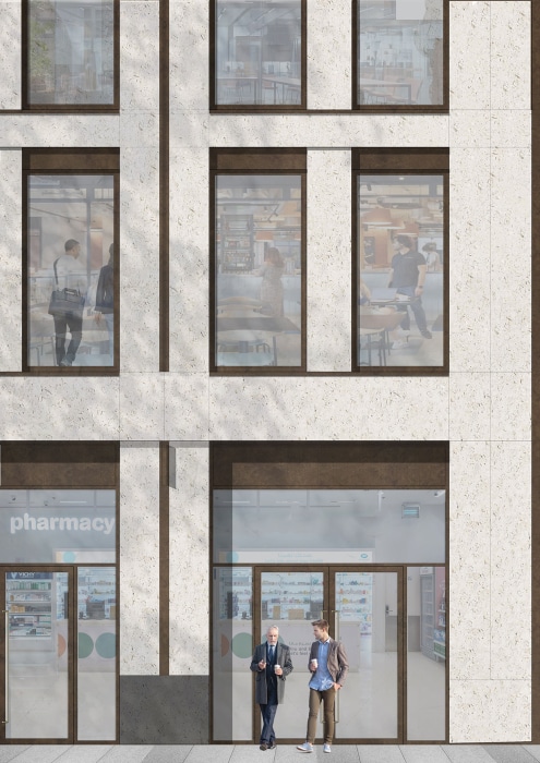 Externally, the existing façades are replaced with two distinct material palettes, reflecting the need for the building to address both the Northern Quarter and Piccadilly Gardens. Reflecting the surrounding historic buildings, the Piccadilly Gardens elevation features light coloured stone, whilst the Back Piccadilly elevation utilises brickwork to reflect the industrial heritage of the Northern Quarter. The set back 6th floor is clad with bronze metalwork. Elements of this metalwork provide detailing to both primary facades and unite the different materials into one coherent proposal.