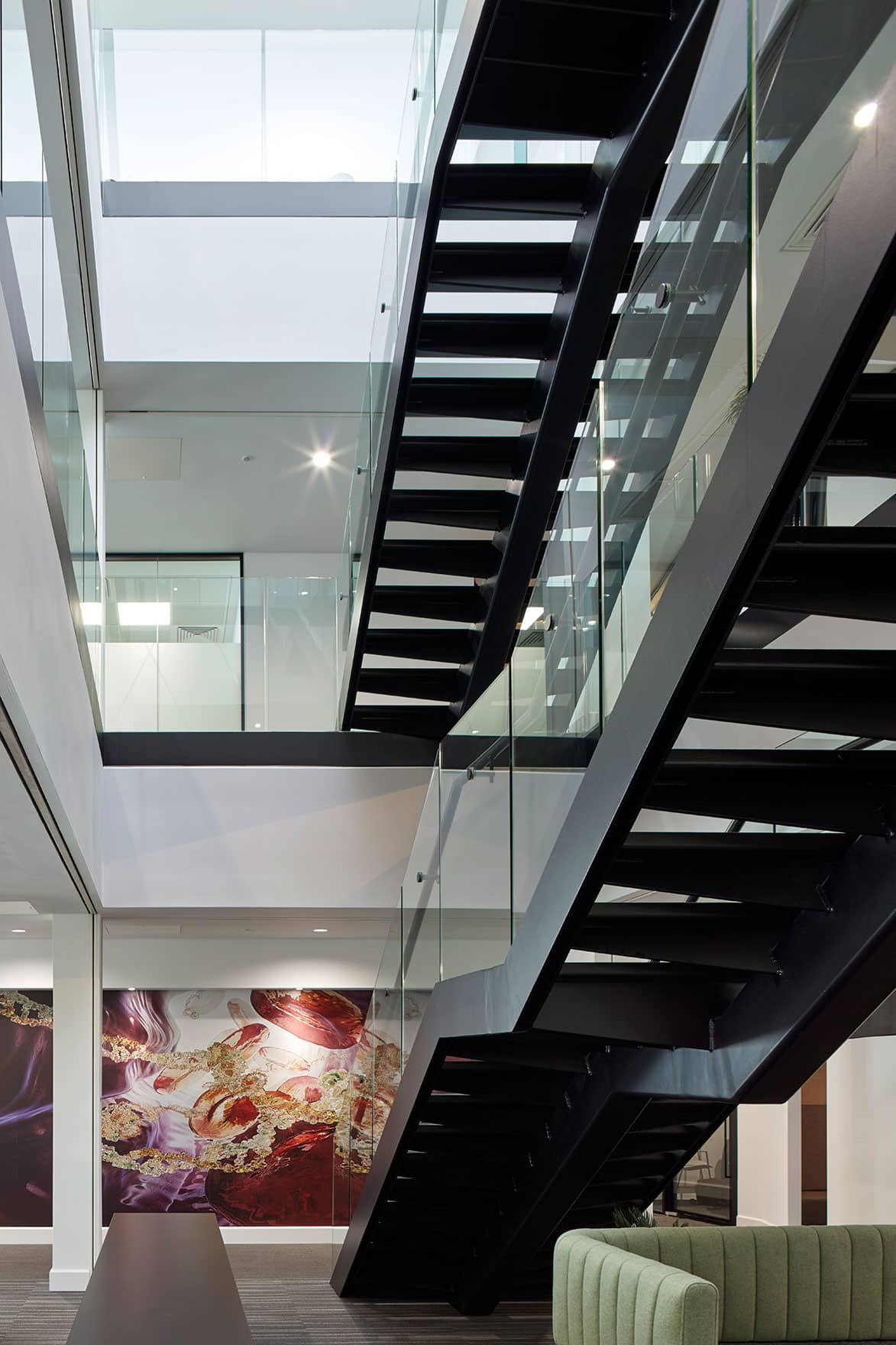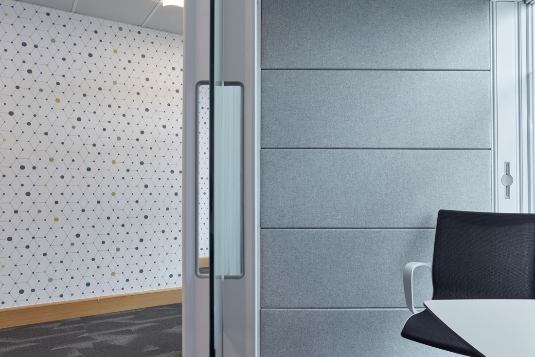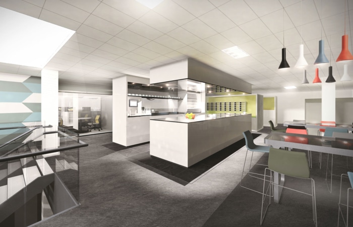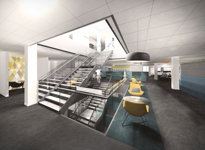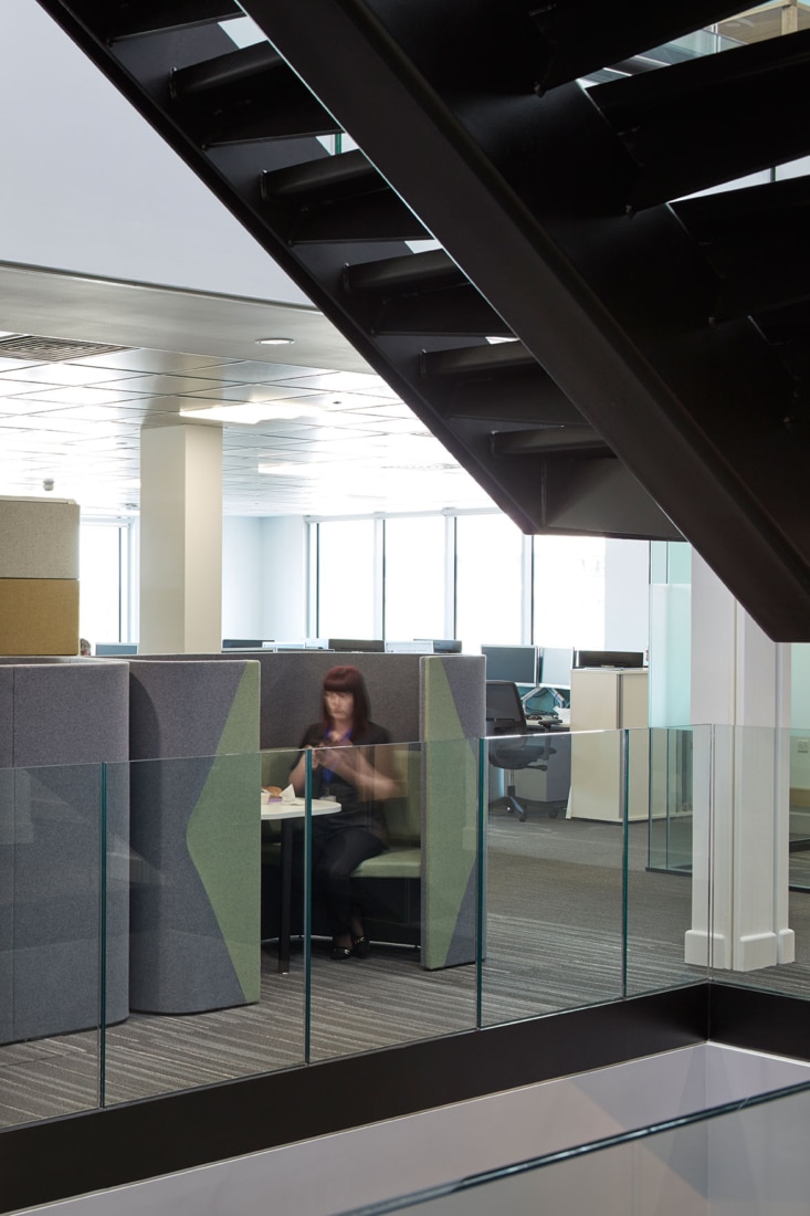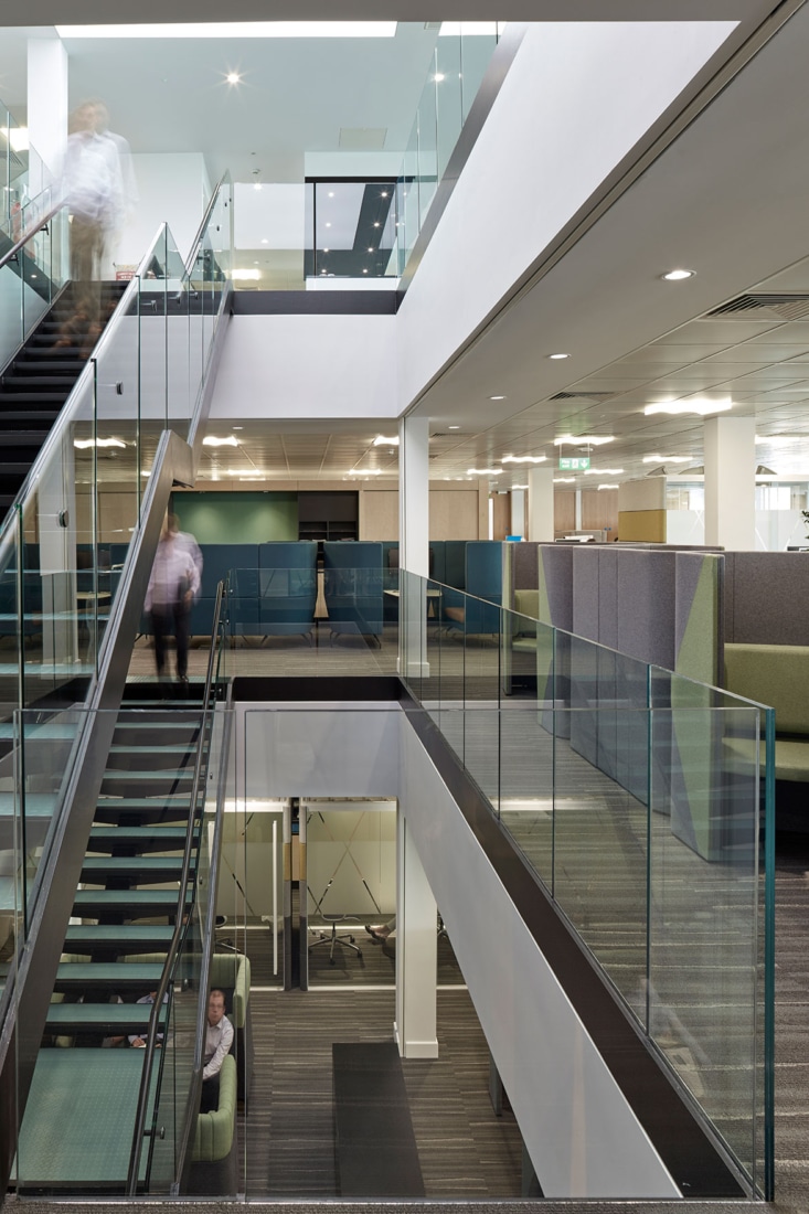 Whilst developing the detailed brief, a concept based on atomic structure and connections, became an analogy for the nodes of the organisation and the connections between them. This translates from the introduction of a triple height, top lit staircase at the centre of the floorplate supporting informal interaction, through to the bespoke joinery and graphic wall coverings.