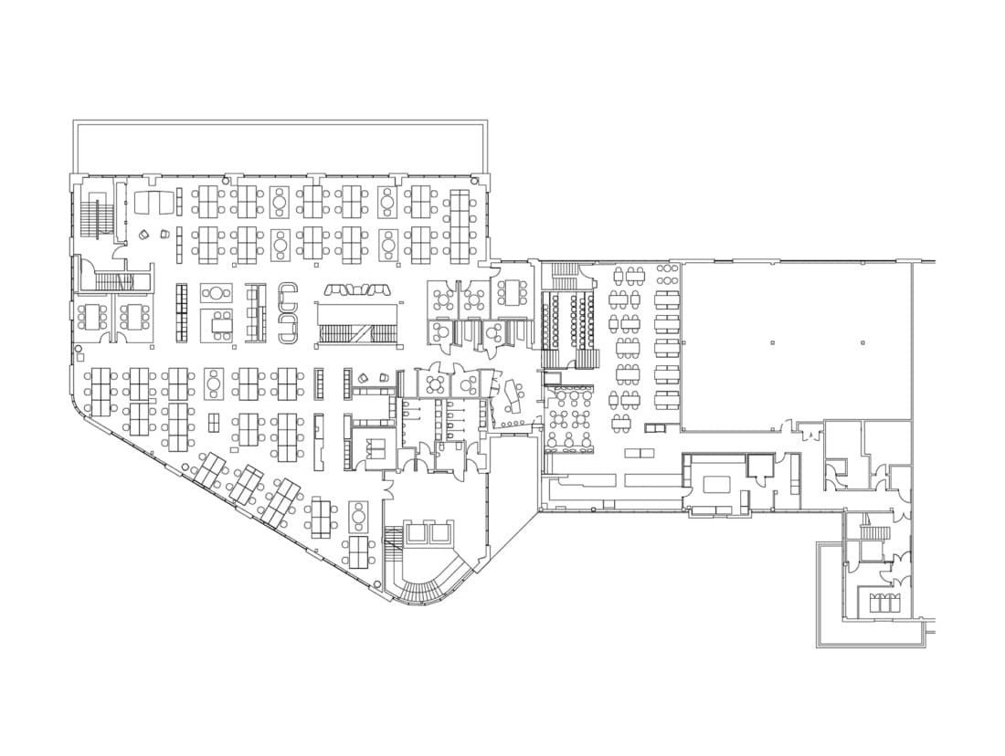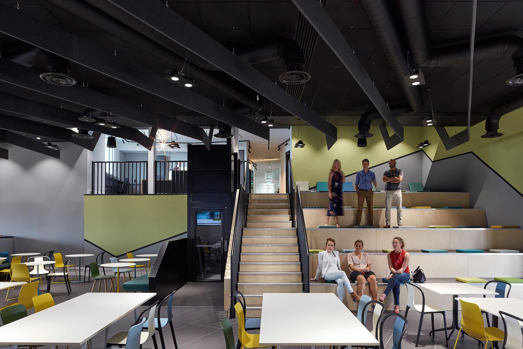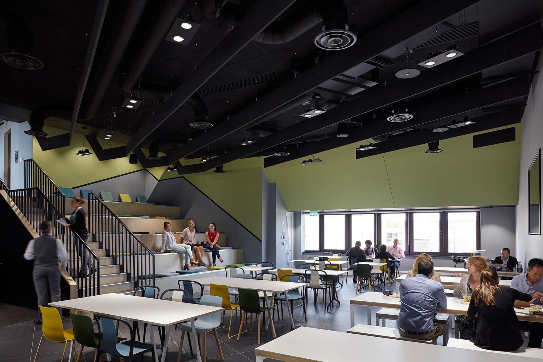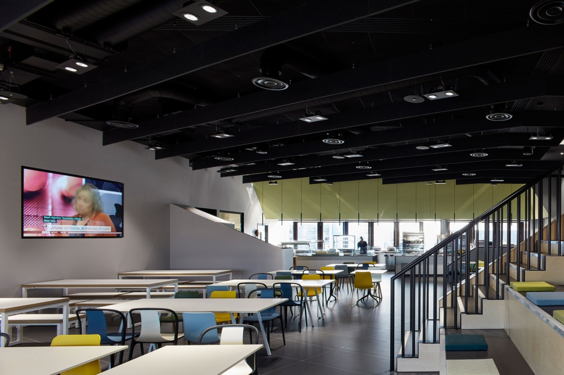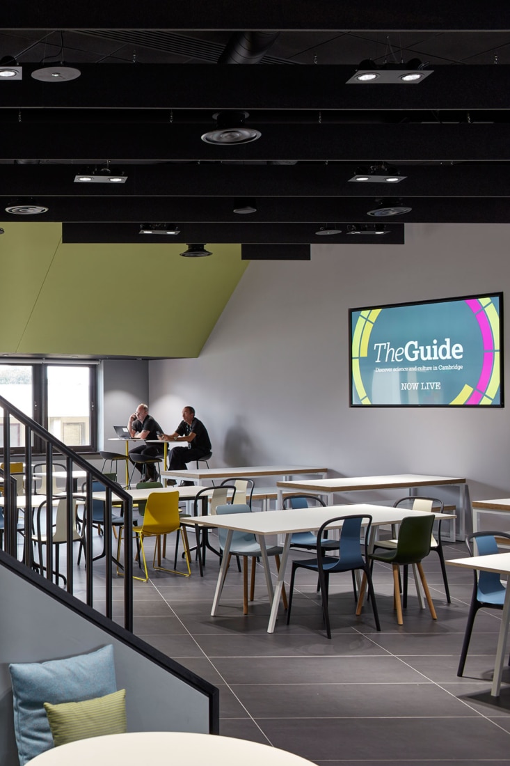 The restaurant that will also serve a nearby future AstraZeneca office will host ‘town hall’ meetings as well as informal meetings and gatherings during less busy times of the day. The height of the space allows for stepped seating providing a setting for the team to congregate in a theatre style format. IT played a significant part and has been integrated seamlessly, all rooms are VC enabled and two telepresence rooms are also provided.