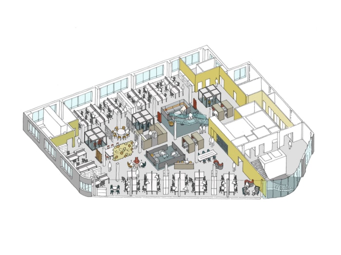 Bespoke joinery hubs, formed in exposed high grade plywood, house storage, printers and lockers and punctuate the open plan areas. A hospitality area, adjacent to the stair can hold events in an open plan lounge style and be used by staff to support informal interaction and happen stance meeting.