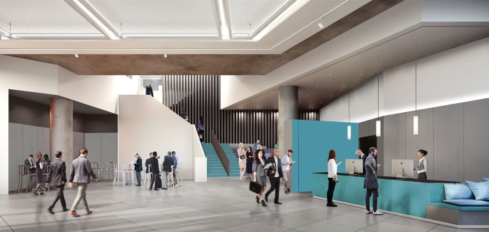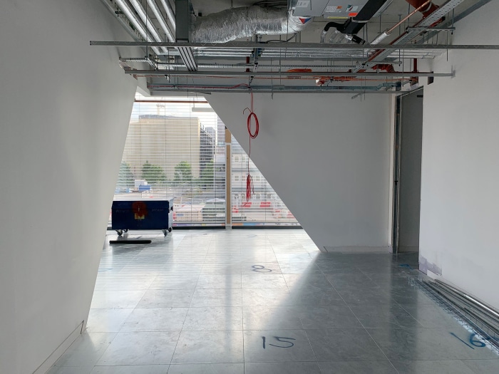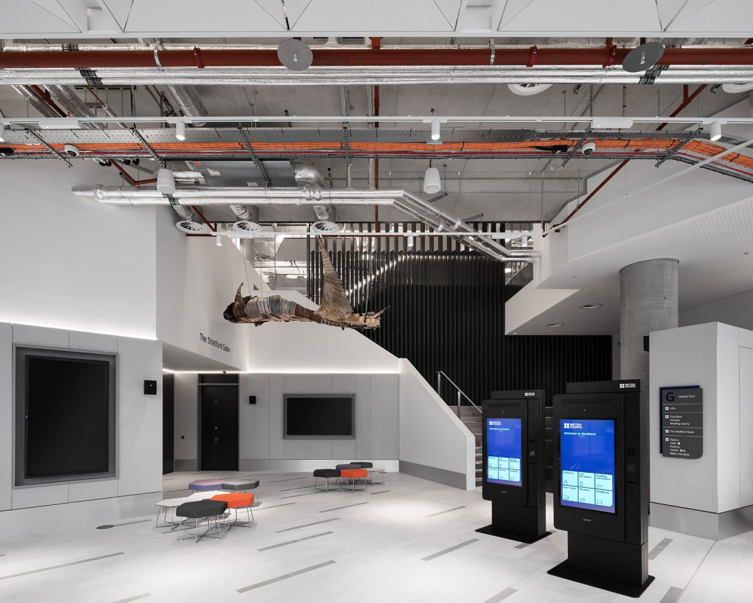 By addressing the security at the ground floor, the design has broken down the typical barriers associated with a normal office reception and creates a welcoming open space, with areas for a range of exhibitions, conferencing, and permanent installations. The full height moving screens can be adjusted to suit a range of different exhibition styles, presentation formats and large events.