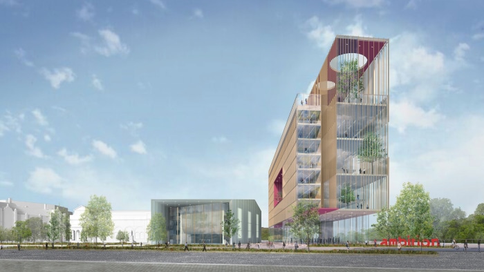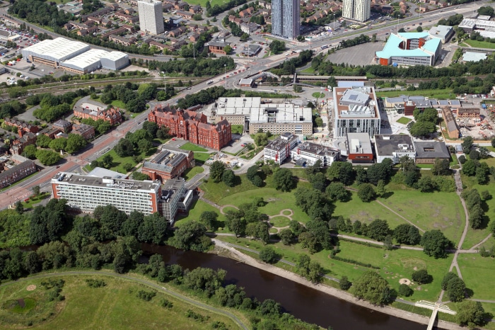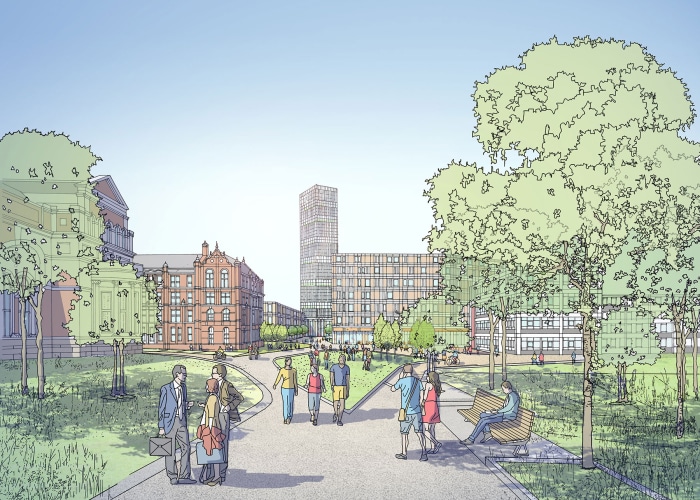 Proposed view illustrating a car-free University of Salford campus and new buildings