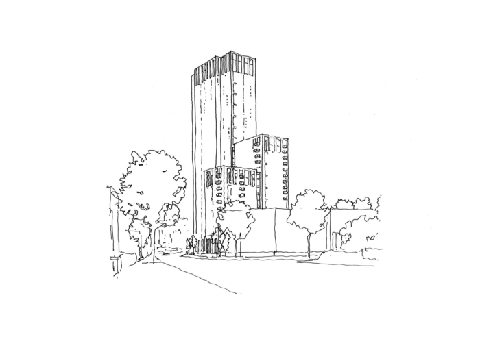 The building’s design features a tower rising to 26 storeys, oriented to address the city, complemented by an adjoining wing that steps from 14 to 20 storeys. Brick serves as the primary façade material, forming a gridded envelope with elements of metal and glazing set within. Large windows enhance the tower’s elegant form, while also creating bright, welcoming interiors and offering unspoiled views.