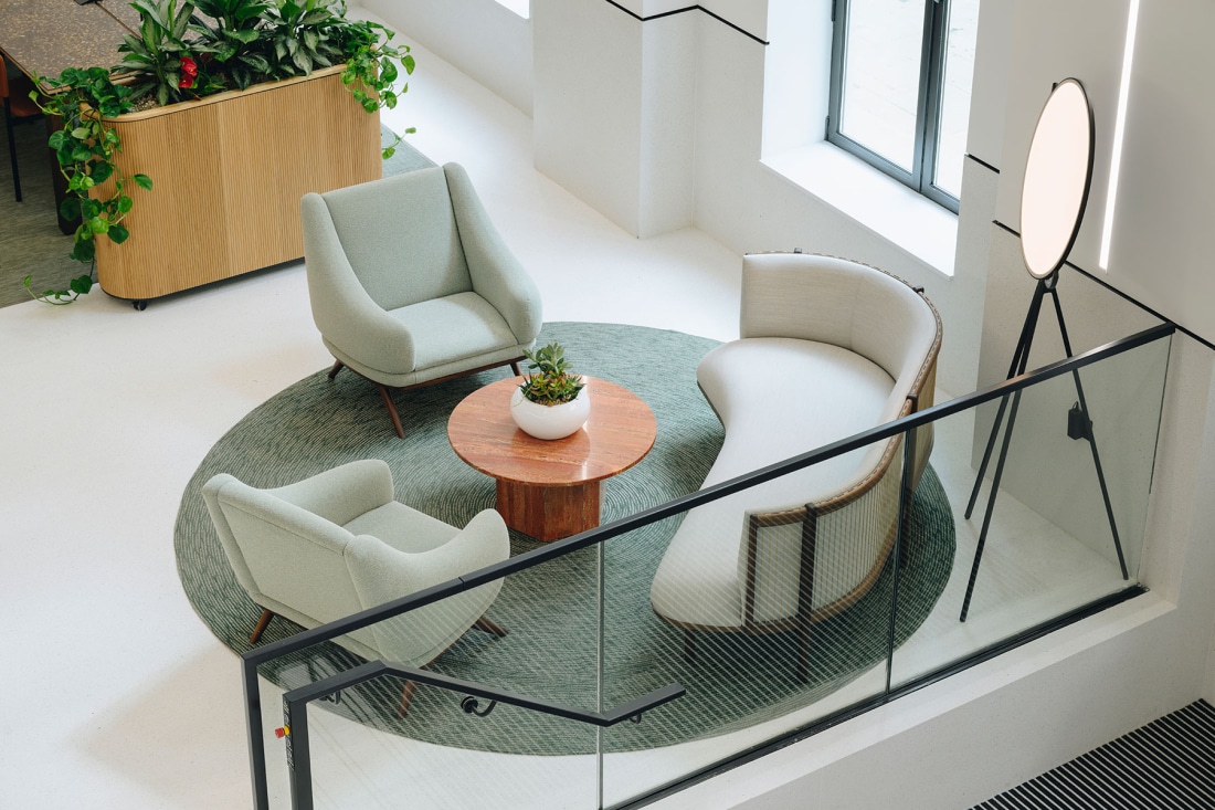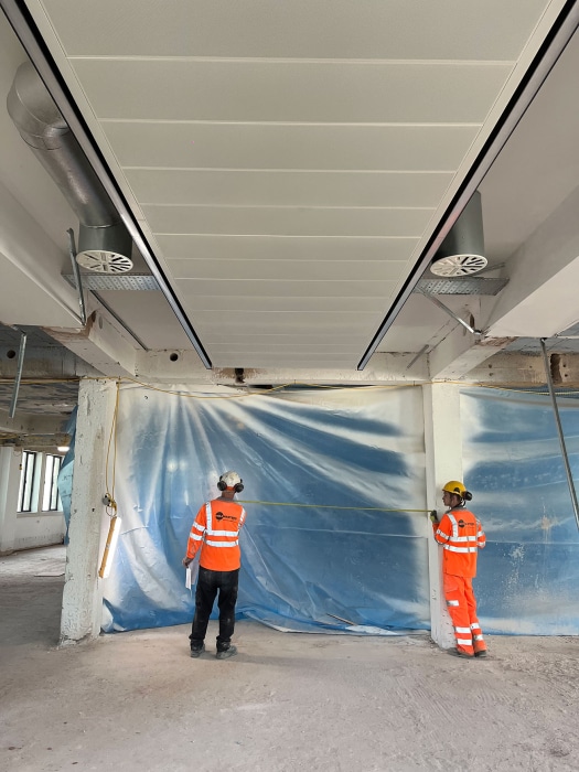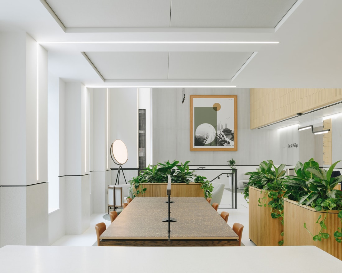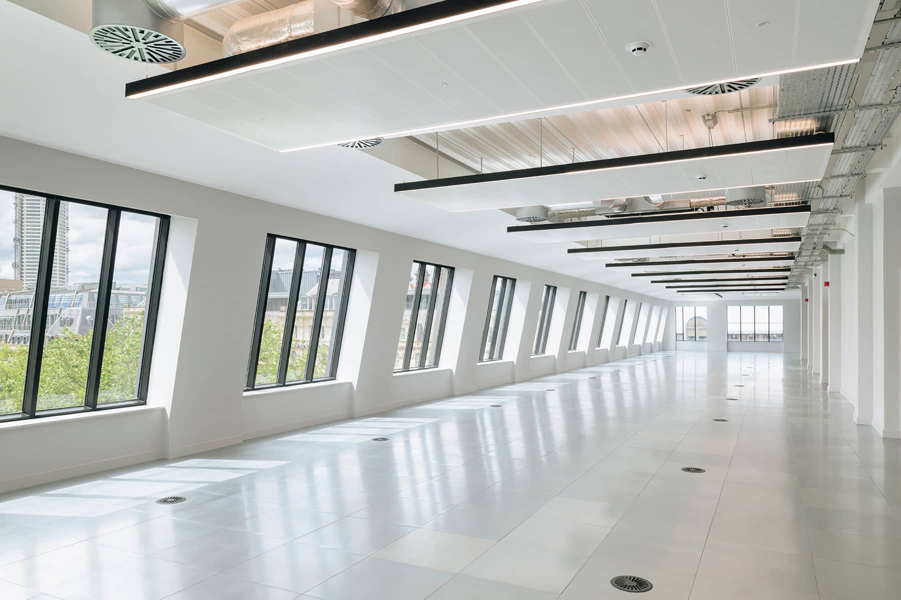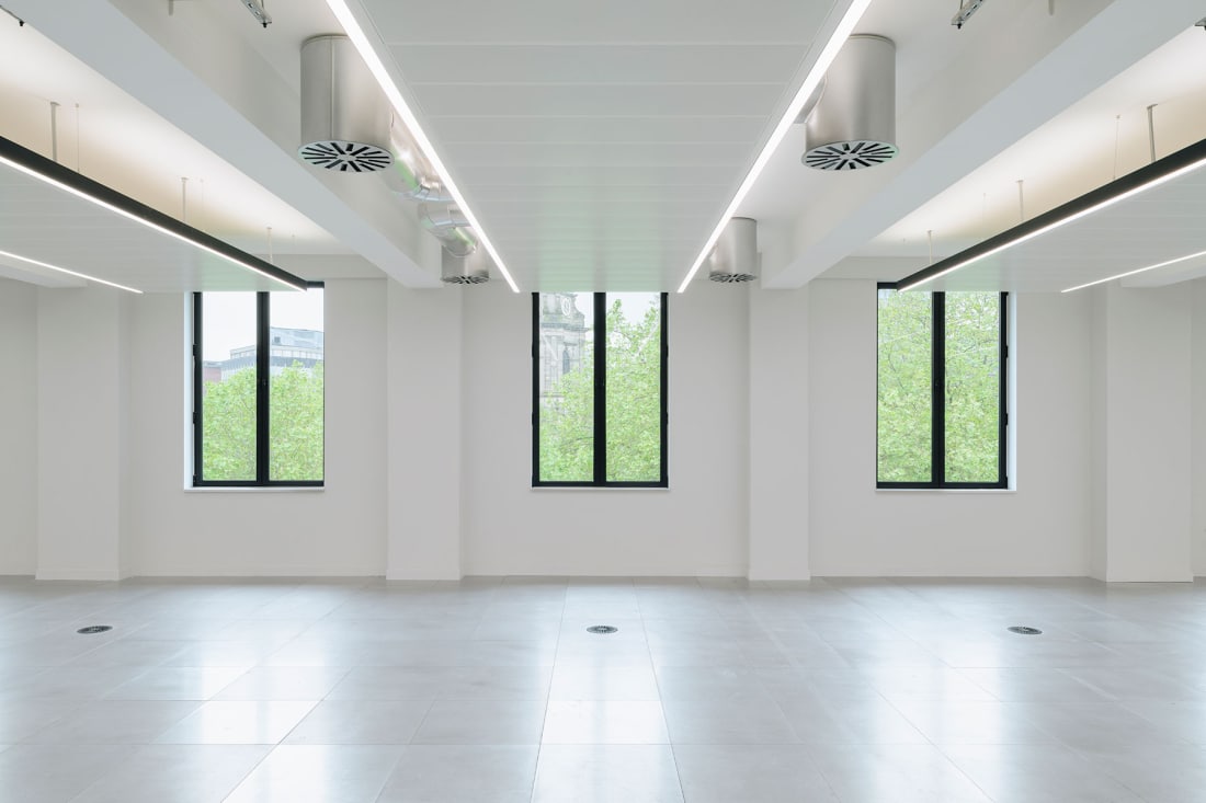 This comprehensive refurbishment and alteration was considered within the context of this sensitive setting and has delivered 65,200 sqft of Grade A commercial workspace across eight storeys. The scheme has created a new accessible entrance lobby and front door with a nod to the buildings’ art deco fretwork. A spectacular new 1,800 sqft double height reception space is complimented by a versatile business lounge within an intimate reach of, and backdrop to, Cathedral Square. A reconfigured core delivers an additional lift, all new lift cars, a new washroom core and fully glazed office entrances leading onto each office suite with views of Birmingham Cathedral visible from every lift lobby and in turn every office arrival space. Each office suite maximises its volume by delivering an exposed soffit and servicing strategy, with the key concentration of services concealed above perforated metal rafts, with integrated lighting and acoustic attenuation. A new raised access floor contains the displacement ventilation. The office suites typically range between 9,400 – 9,700 sqft, the First Floor office suite at 8,500 sqft is complimented by an 860 sqft private external terrace. All of which have the flexibility to be sub-divided. Two smaller suites at 1,100 sqft and 4,400 ftsq have also been created.