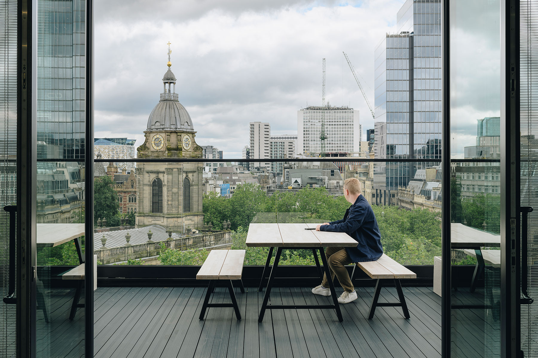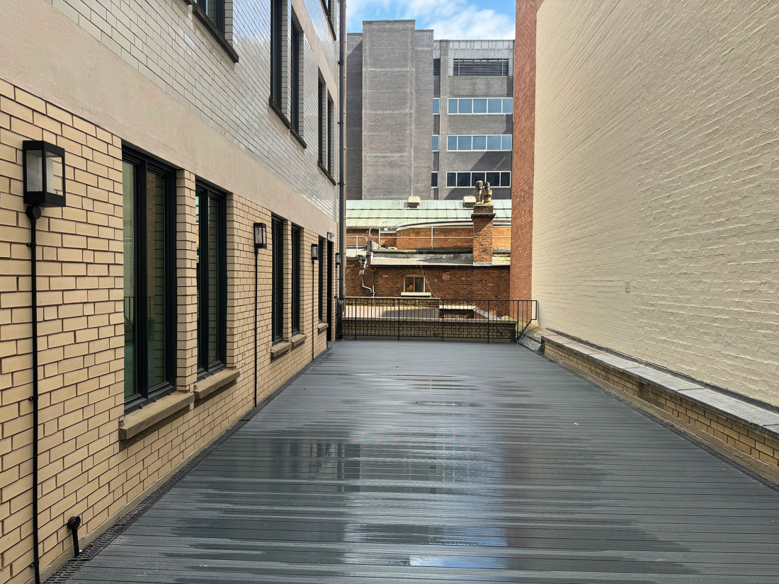 The rationalisation of the top floor internal and external plant rooms has made space for a new rooftop extension with direct access onto a 2,000 sqft south facing rooftop terrace overlooking Cathedral Square and the rooftops of Colmore Row. A flexible space has also been created for an exclusive office or a communal amenity space which opens out onto the terrace. The terrace can be used for both private and/or communal use.