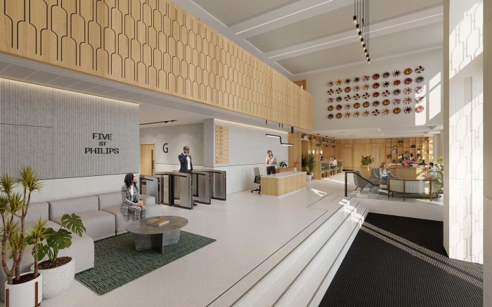 Five St Philips is an existing building located at the heart of Birmingham’s Central Business District, at the corner of Colmore Row and St Philips Place. The building is situated within the Colmore Row and Environs Conservation area, adjacent to the Grade I Listed Birmingham Cathedral and fronting Birmingham’s most prestigious square, Cathedral Square. The site is the former Blue Coat School, which was established in 1730 and stood on the site until 1930.