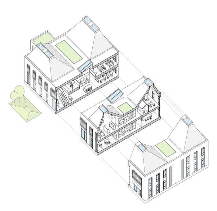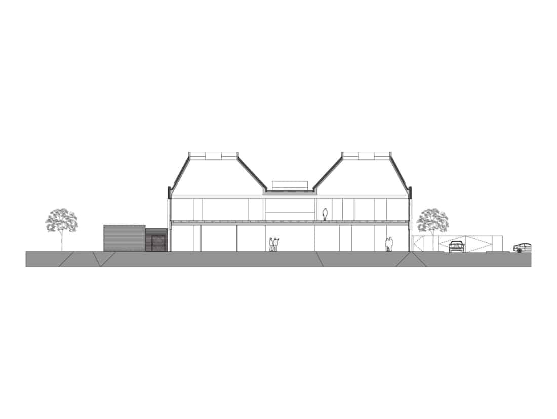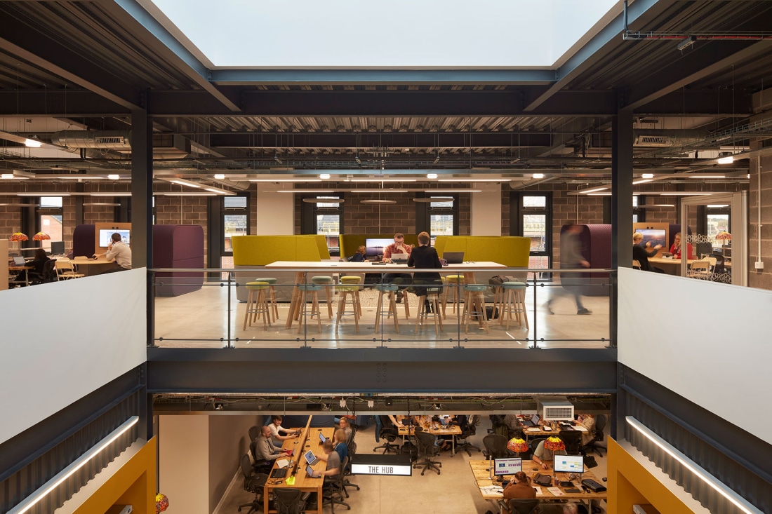 Internally, the 1,500sqm office building is split across two levels, with the stair cores pushed to the perimeter of the building to allow for a ‘service’ spine between the office spaces. The building is derived from a 1.5m planning module and is arranged around a central, double-height atrium providing good daylight penetration to all areas of the floor plates. The atrium acts as a hub of activity and connectivity between the office wings.