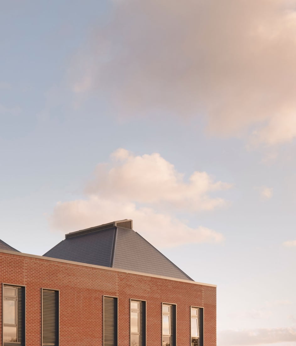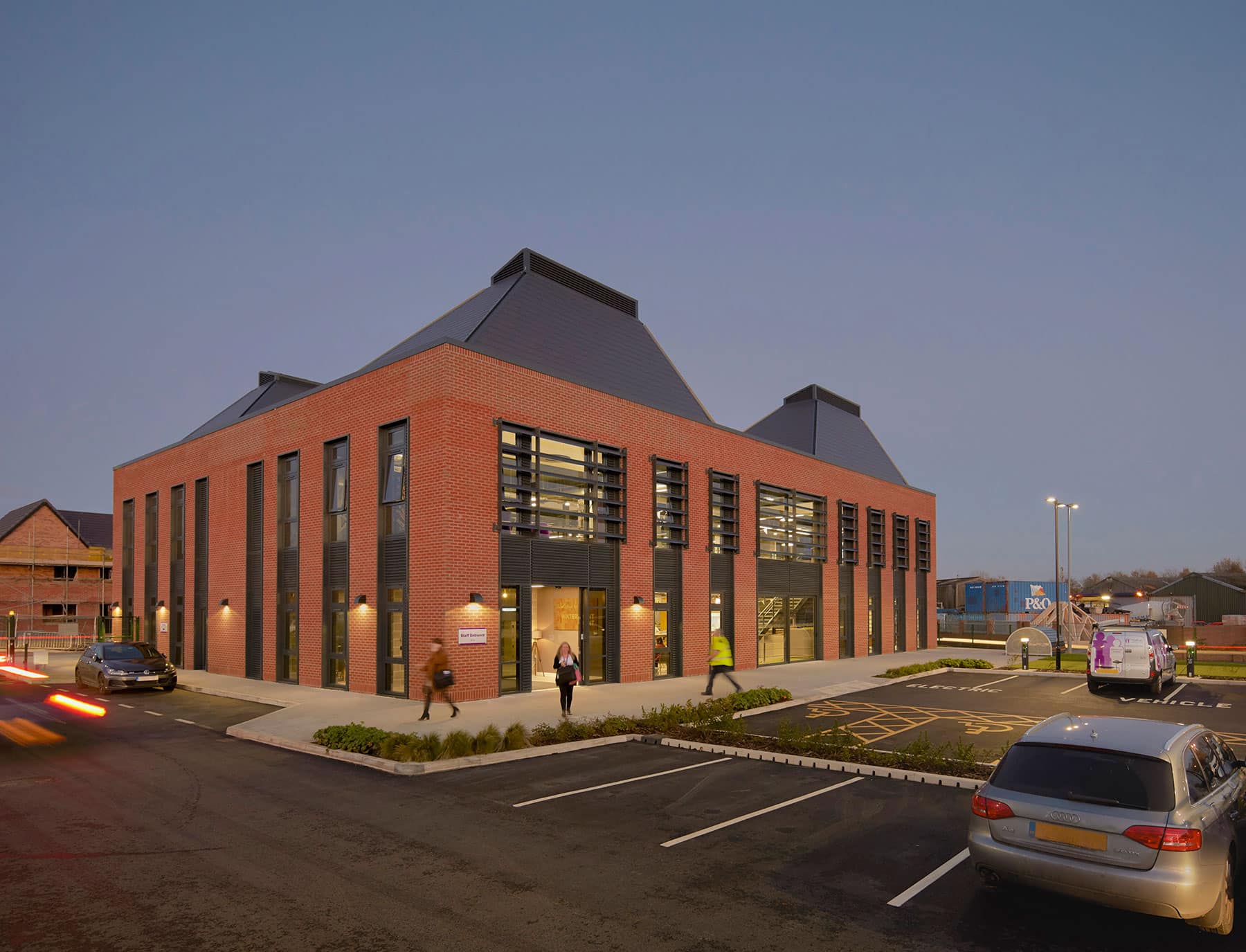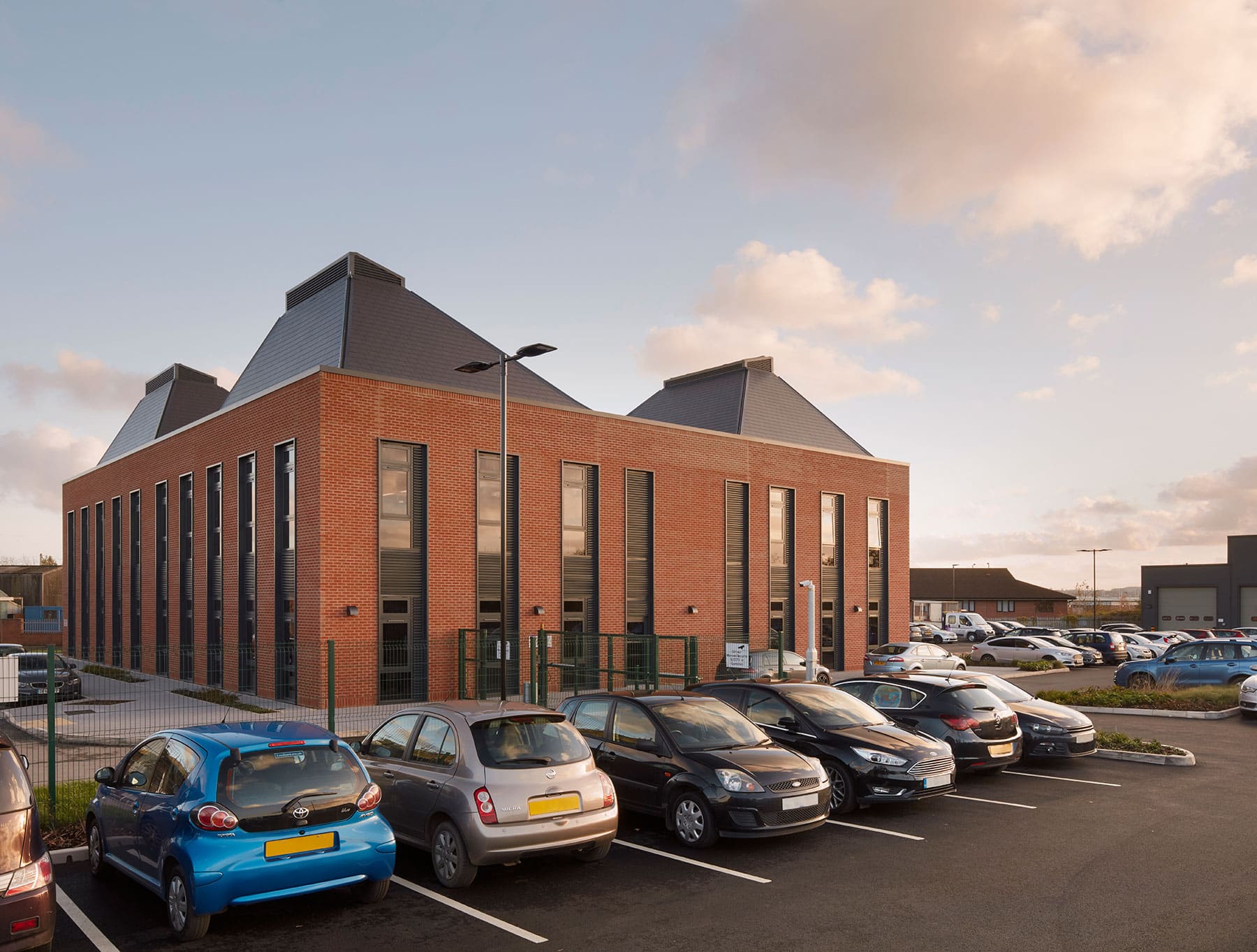 Externally, the form and materiality of the building borrows from the adjacent residential development and also references the primary function of the organisation. Four roofscape forms act as mini-atria, allowing natural light to penetrate the building and provide passive stack ventilation. Solar shading on the south elevations reduces internal heat gains whilst allowing views onto a south facing, landscaped terrace.
