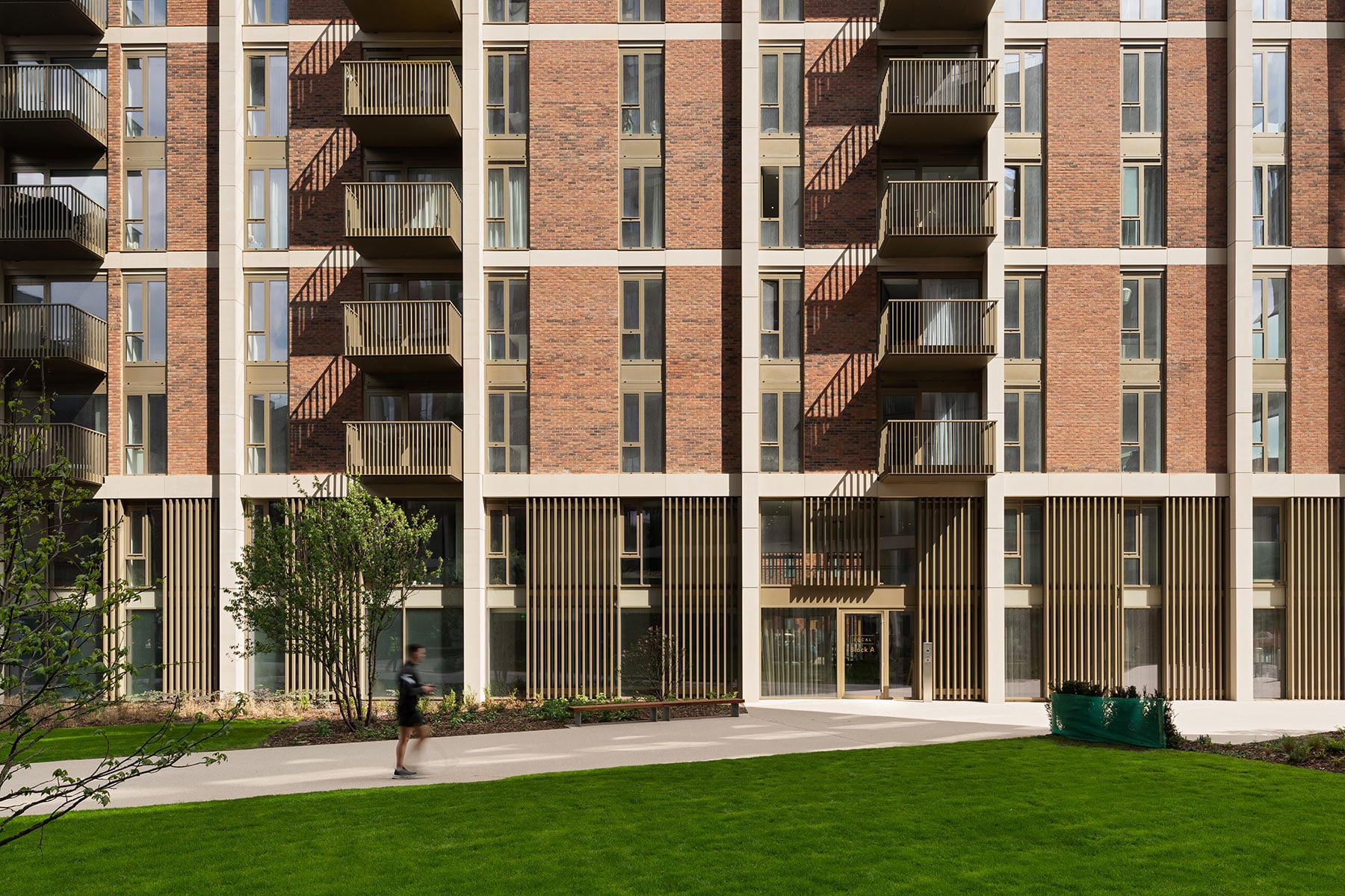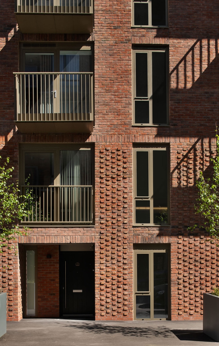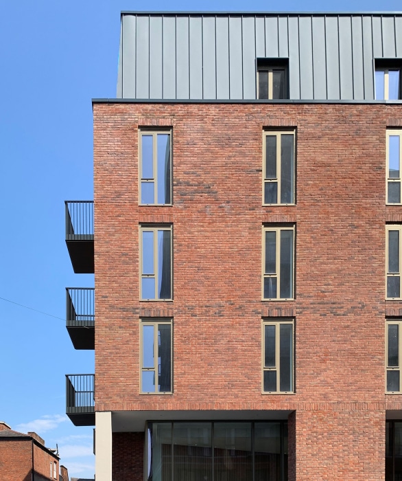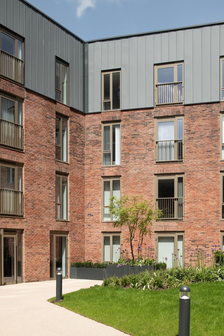 Materiality focuses on the predominantly used red brick whilst a precast concrete frame reflects the vernacular stone detailing of the civic buildings nearby. Promoting permeability and activity, town houses and commercial spaces have been incorporated at ground floor level. Terraces reinforce the street scene and reflect the significant Grade II listed Crescent terraces adjacent.