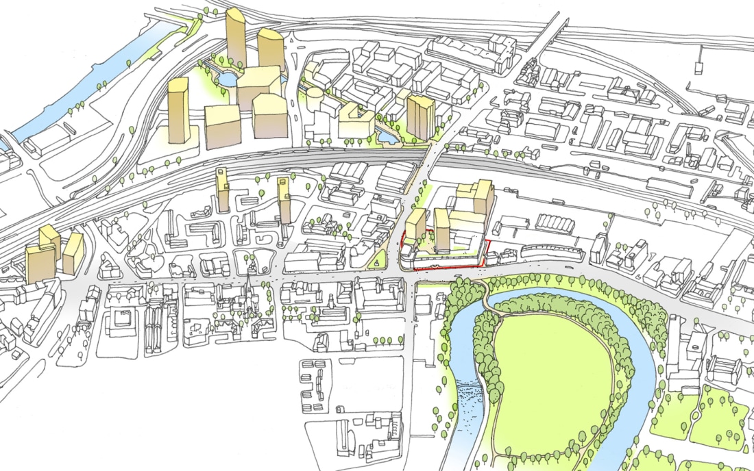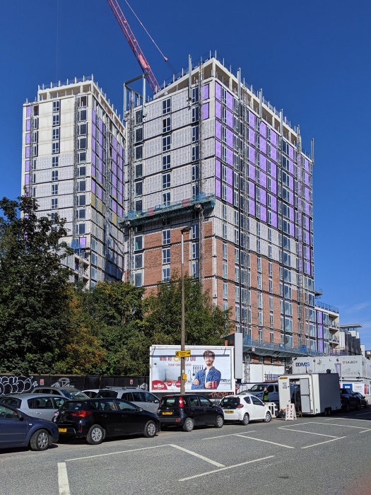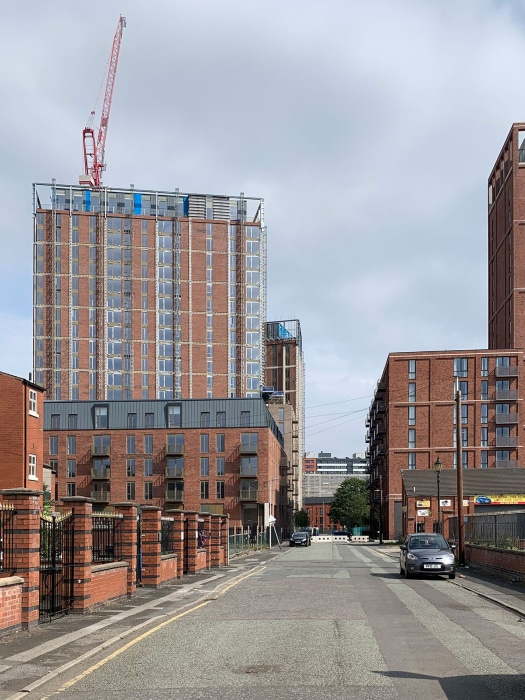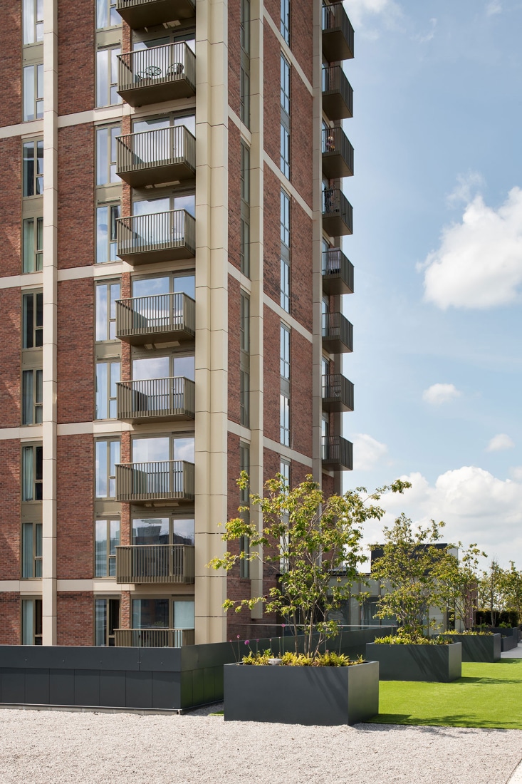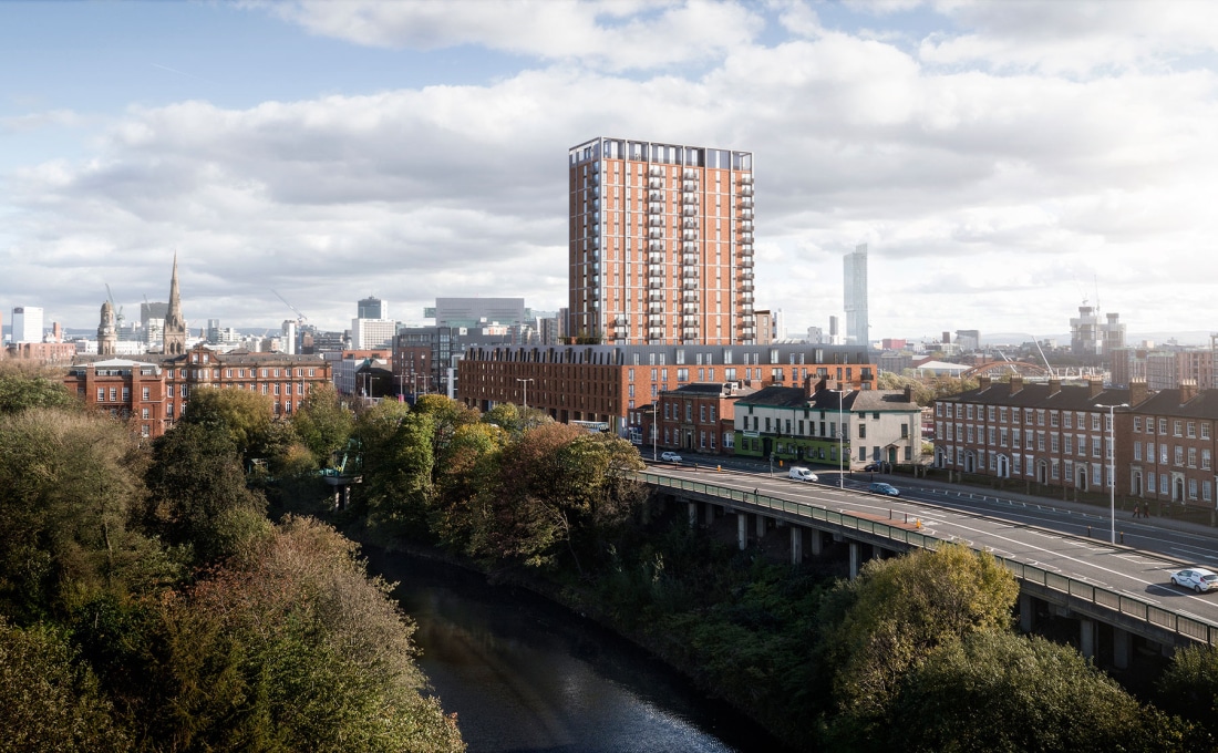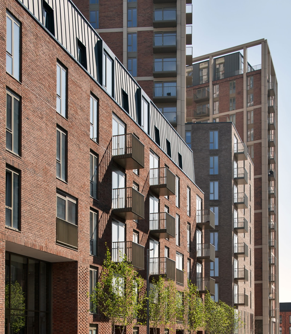 The 399 dwellings include two towers of 22 and 16 storeys, marking a gateway between Salford and Manchester whilst maximising views out for the residents. The scheme works as a cluster of taller elements when read against proposed tall buildings at the neighbouring Outwood Wharf.