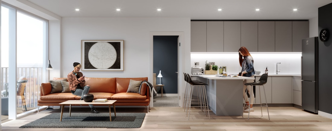 Local Crescent provides a complimentary private sale offer for this part of the city, with all the units designed to the highest quality. They are complemented by extensive amenity space to promote activity and help foster a sustainable community. A public landscaped courtyard at ground level and private landscaped roof terraces on the 1st and 5th floors are incorporated. Additional amenities include a main reception with concierge, a gym and cinema room, a swimming pool and solarium spa and a launderette/lounge.