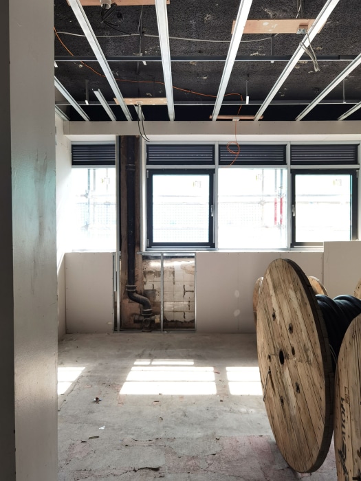 The re-purposing of the space provides a low up front embodied carbon approach whilst significant fabric upgrades create significant improvements to operational energy demands. In keeping with this approach perimeter serviced office space is designed to be naturally ventilated with the opportunity to retrofit MVHR units only if required by tenants. Existing escape staircases will be maintained. These are shared with the ground and basement tenants. New building services are proposed throughout. Refurbishment works due complete summer 2023.