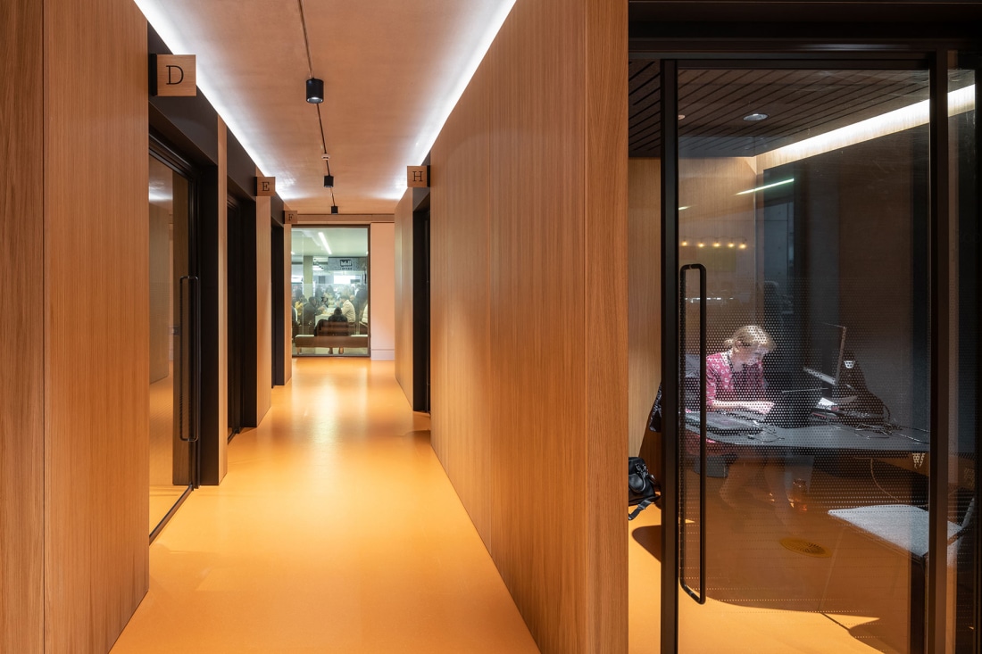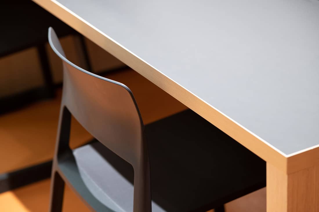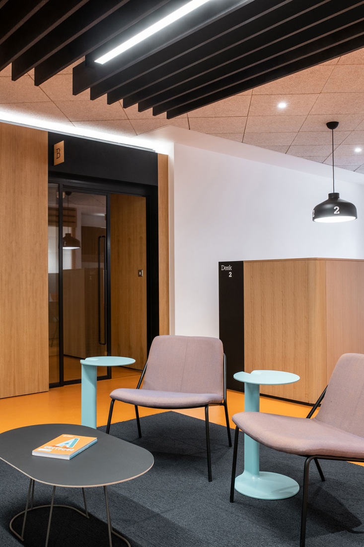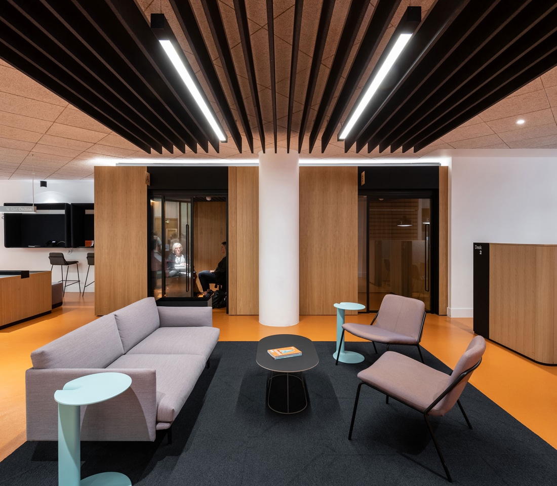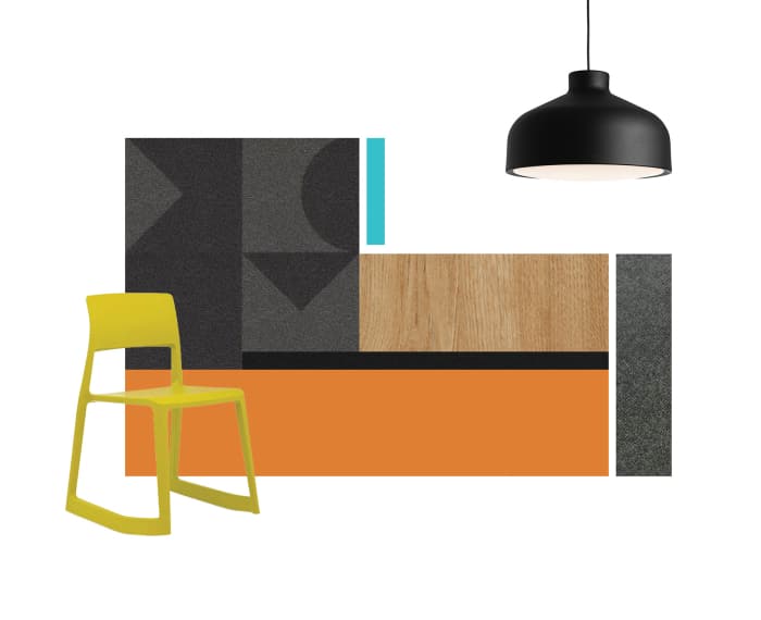 Materials for these parts were selected for their ability to blend with most finishes; thereby allowing for flexibility and relocation as required. To define each hub, accent colours are used within the flooring and loose furniture to add a bold, fun and unique element to the design.