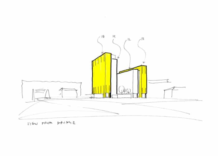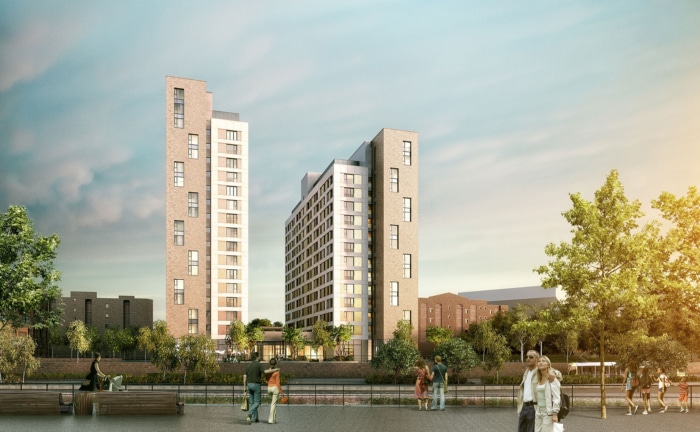 Our design response consists of two structures – a 15-storey and an 18-storey building connected by a landscaped podium – which will deliver a 354 unit Private Rented Sector (PRS) development. The sustainable redevelopment of this site will deliver a new gateway marker, create new homes, improve the quality of the public realm around the site and the waterfront, and potentially initiate a regeneration process along Trafford Wharf and the A56 corridor.