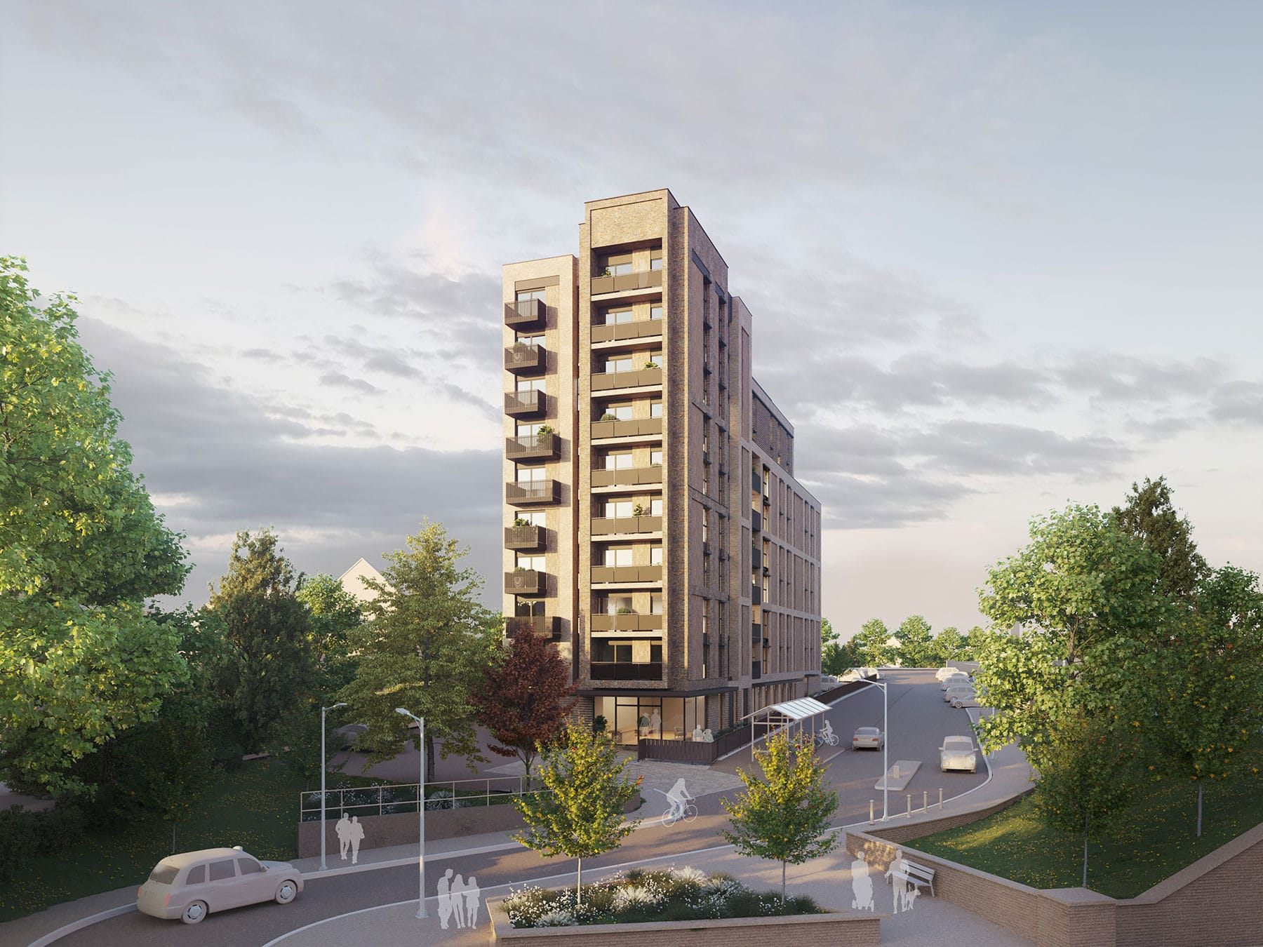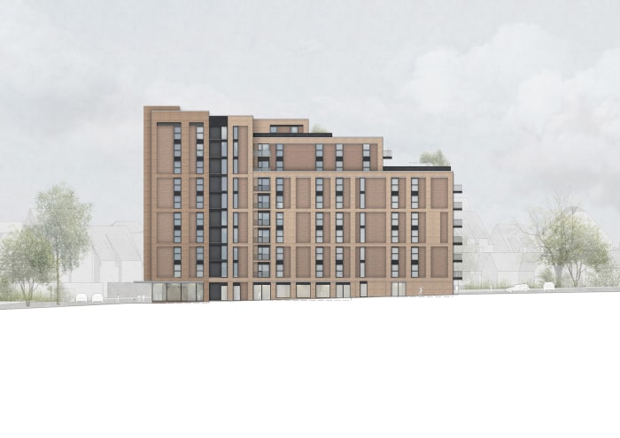 The quality of the residential accommodation is a key consideration of the design with the vast majority of the apartments being either south/west facing or dual aspect. Balconies have been considered where appropriate and a communal roof terrace has been provided to facilitate access to semi-private open space for all residents. There is a single main entrance to the building, located beneath the tallest element at the closest point to the town centre and main site entrance. The scheme responds uniquely to this site, and represents a bold, but appropriate, urban response.