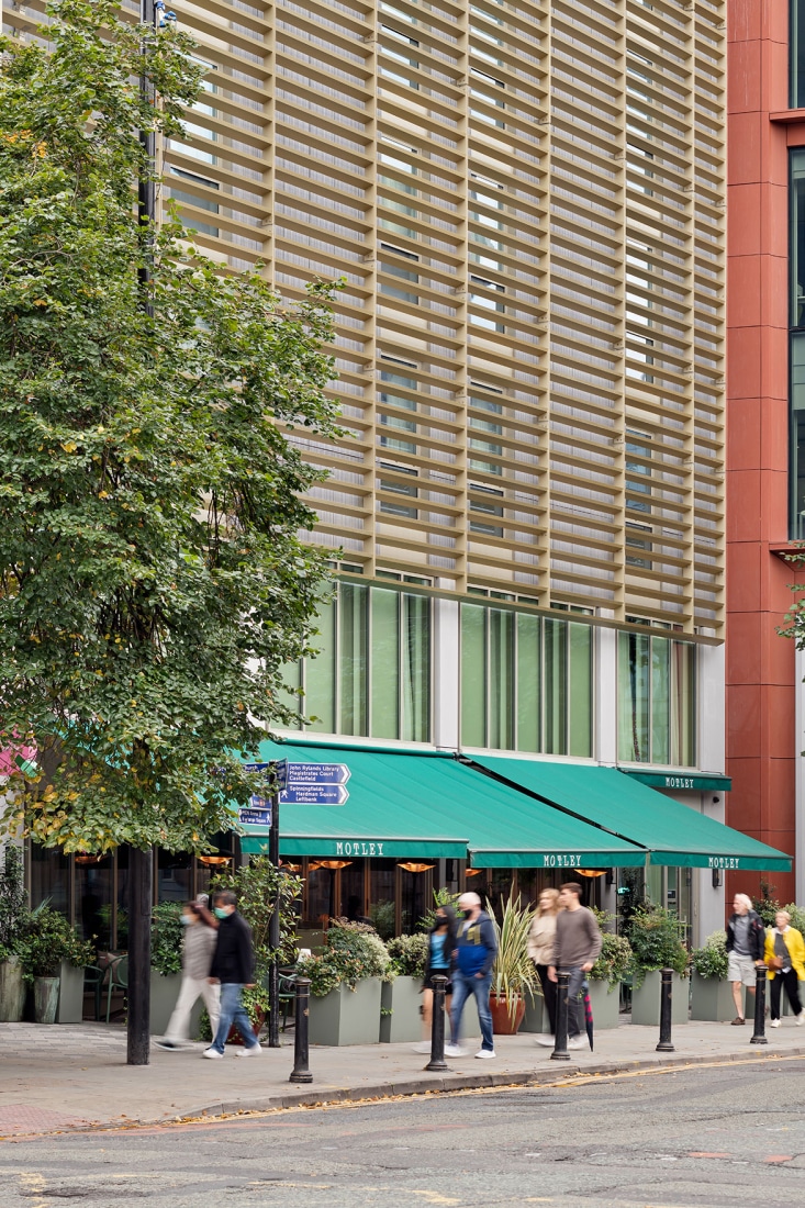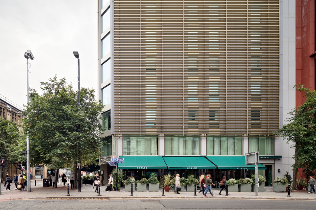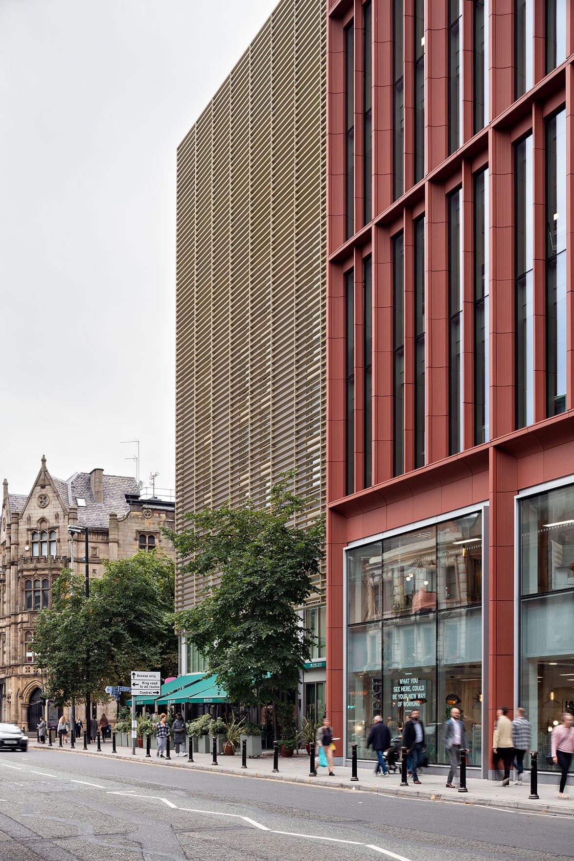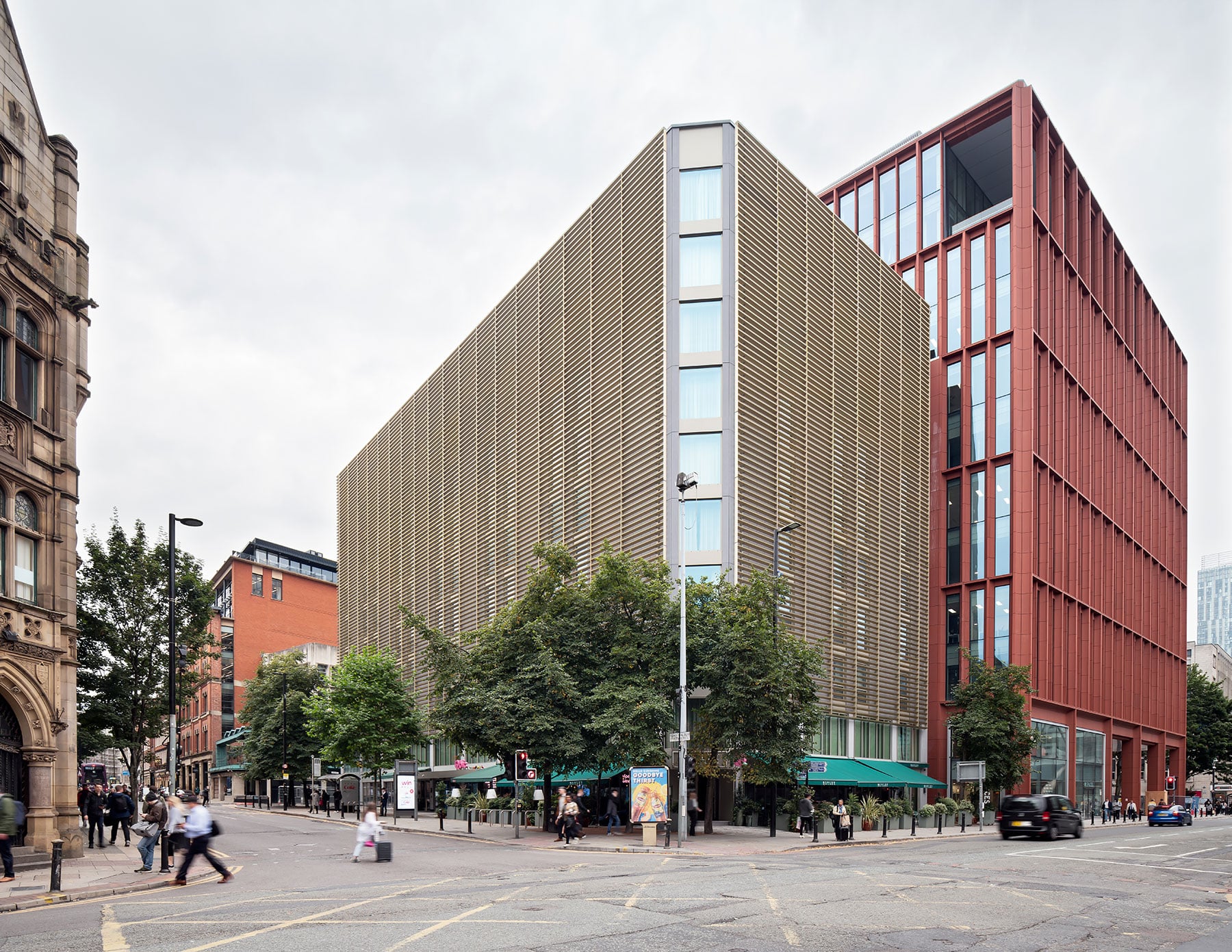 A double storey base is incorporated and, above, the distinctive gold veil is designed to declutter the building. It is this device that brings all of the disparate parts together in one single architectural statement, and hides a multitude of sins in terms of the structural grid. The veil is made of regency gold anodized aluminium and is intended to complement Deansgate’s materiality. The most significant buildings down Deansgate are yellow sandstone – our building was conceived as a modern take on that.