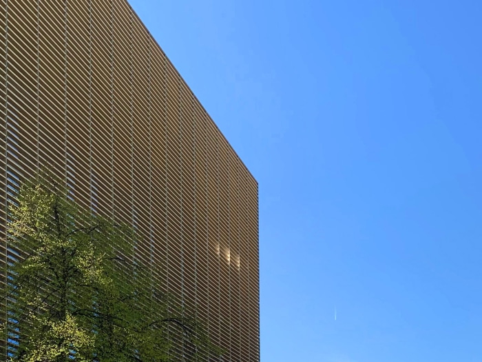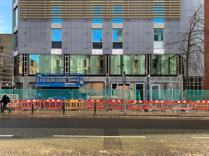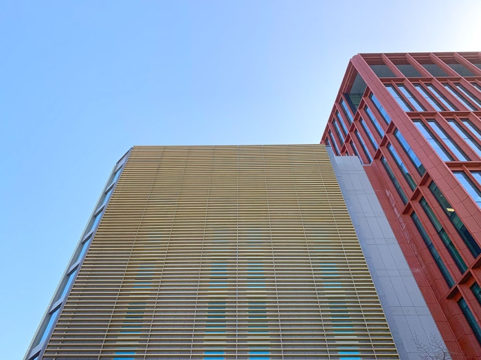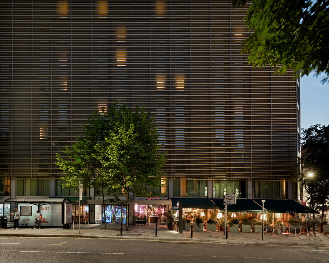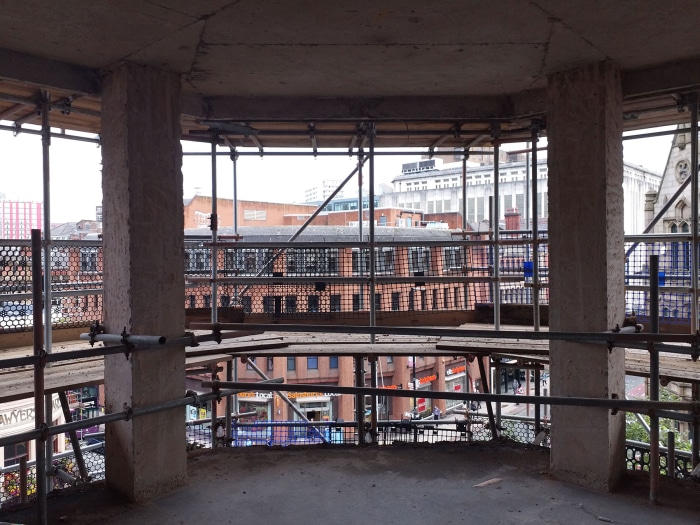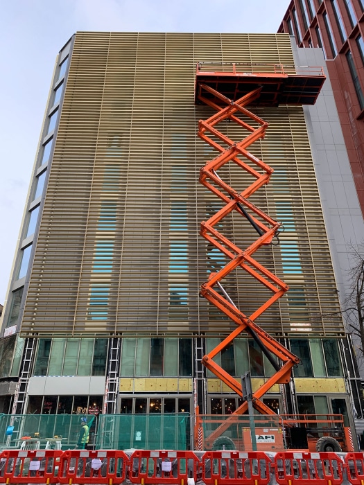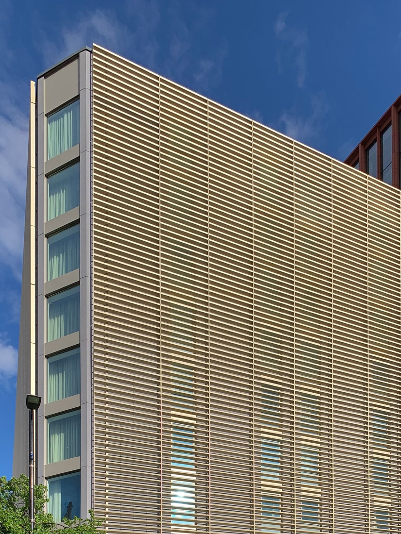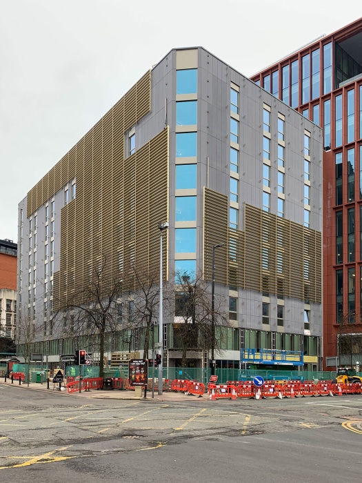 A double storey base is incorporated and, above, the distinctive gold veil is designed to declutter the building. It is this device that brings all of the disparate parts together in one single architectural statement, and hides a multitude of sins in terms of the structural grid. The veil is made of regency gold anodized aluminium and is intended to complement Deansgate’s materiality. The most significant buildings down Deansgate are yellow sandstone – our building was conceived as a modern take on that.