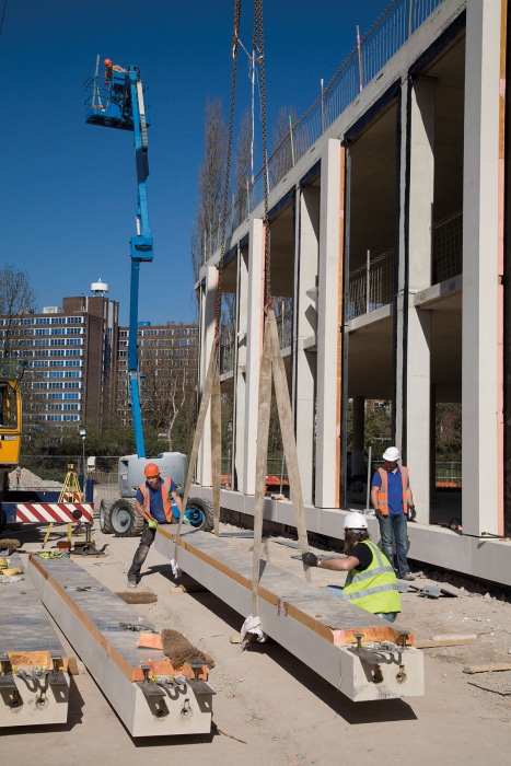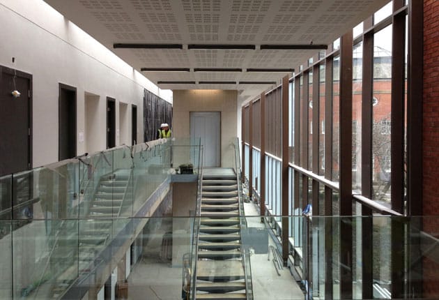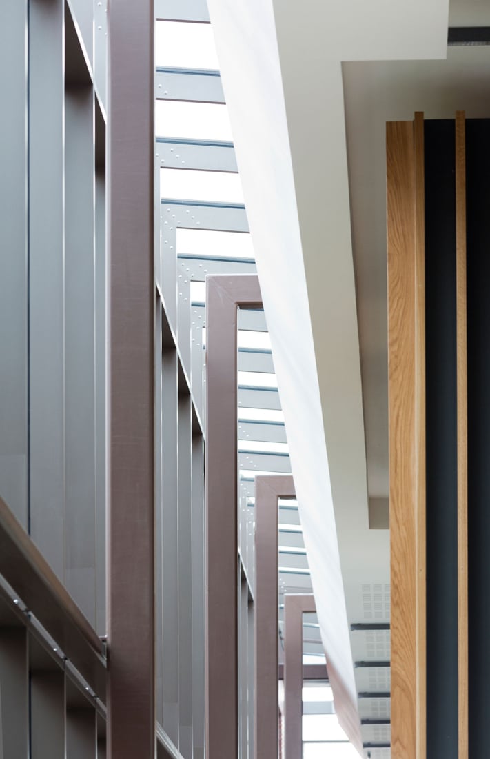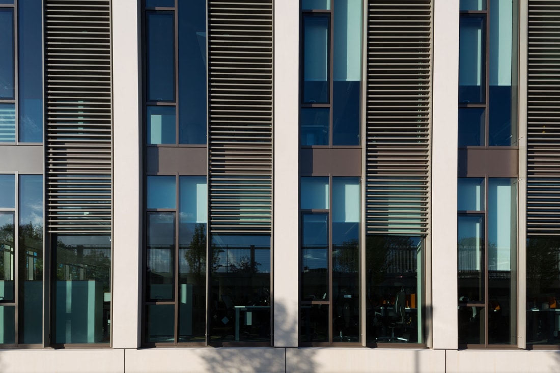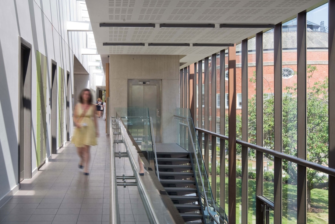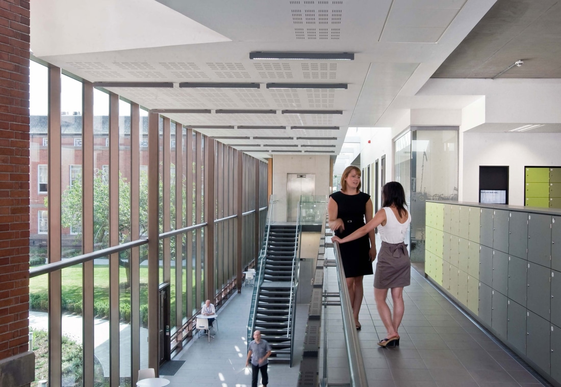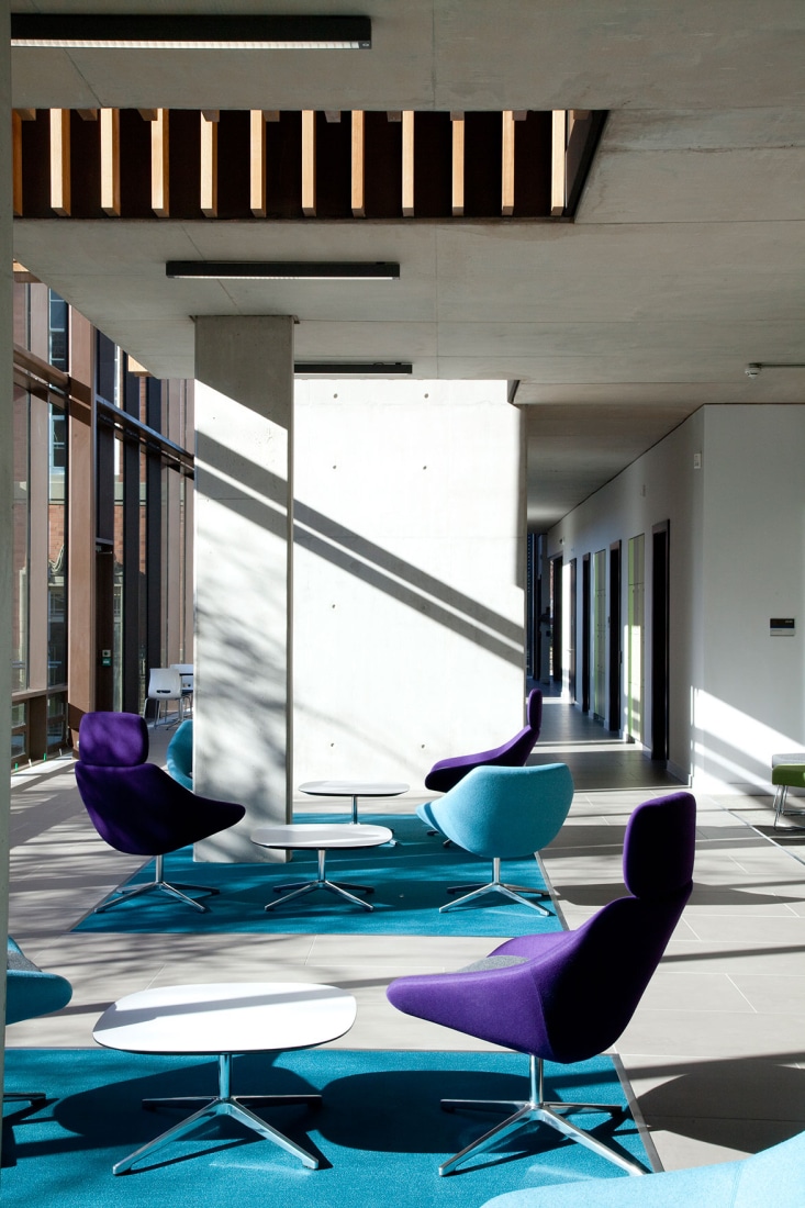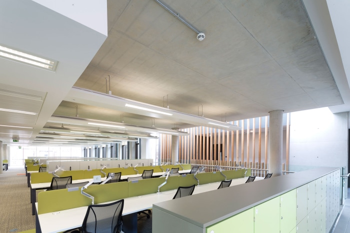 The new 35,000 sqft sustainable office space is accommodated within three, 2 storey wings aiming to reduce desk allocation, improve efficiency and staff retention. All three of the above components are connected by a two storey high “internal street” acting as the main organiser of the building. The 3 office wings are 15 metres wide allowing for good natural daylight and the integration of natural ventilation. This highly sustainable strategy is further supported through the use of active chilled beams combined with an exposed concrete frame to create a low energy strategy during times when cooling is required.