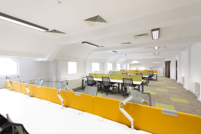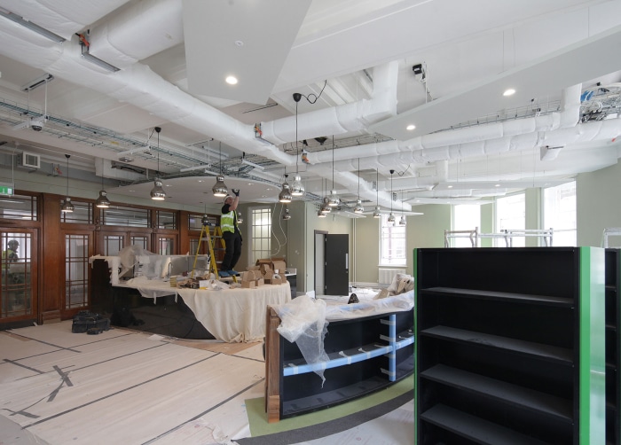 Constructed from a combination of simply detailed solid and veneered oak, the replacement furniture provides a more comfortable, flexible configuration and integrates the fresh air supply, more reflective of this point in the building’s history.