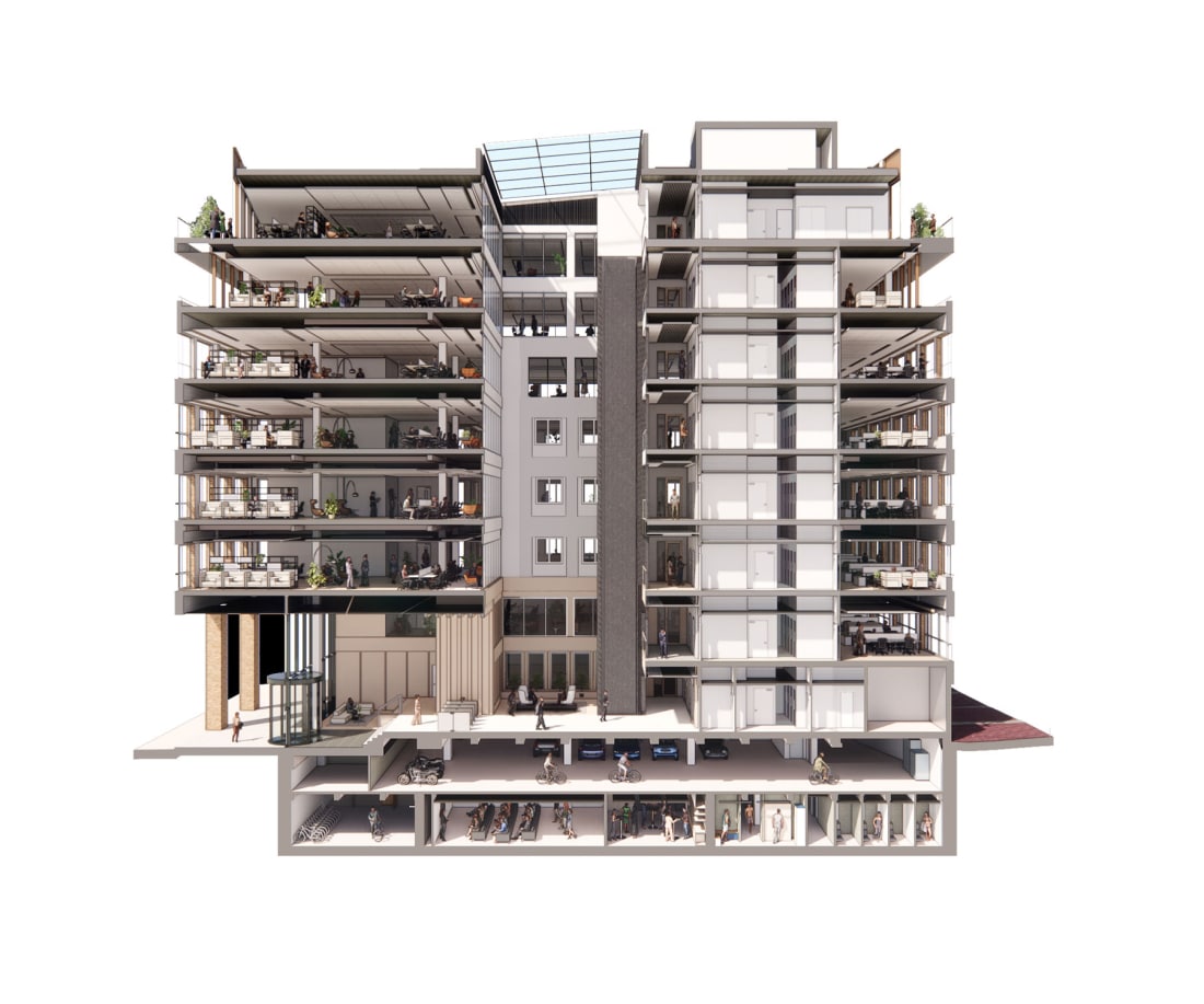 Industry suggests that up to 70% of embodied carbon for a typical office is accounted for in the Substructure, Superstructure and Façade. The building aims to embed sustainability in the way the building is designed, constructed and managed. At least 80% of the original structure is being retained which should cut the buildings embodied carbon by over half, compared to a new office building.