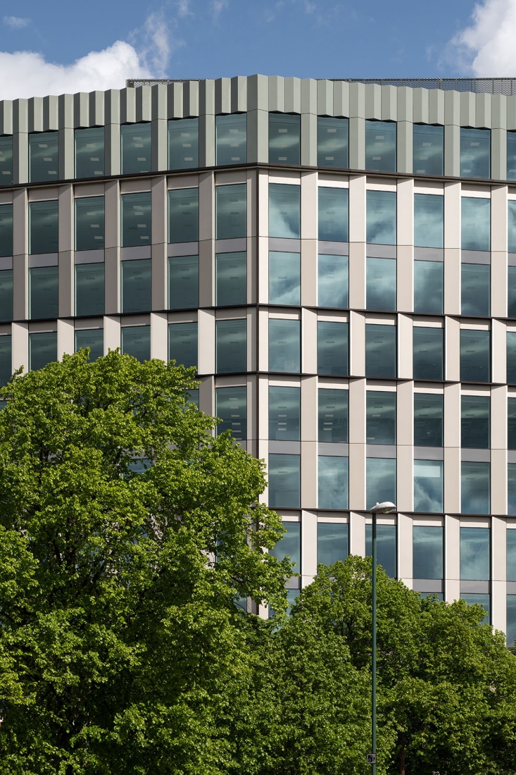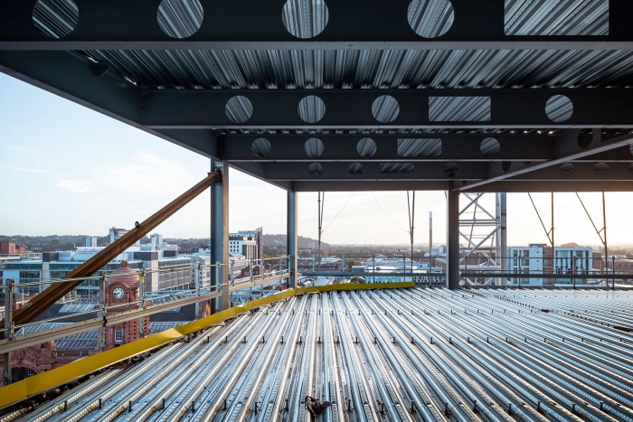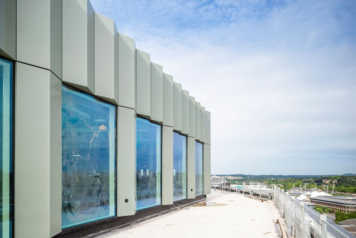 The top of the building provides a series of tapering panels with a green accent as the building crown. A terrace is provided along the north elevation creating a dialogue with the neighbouring Nottingham Castle and offering extensive city views.