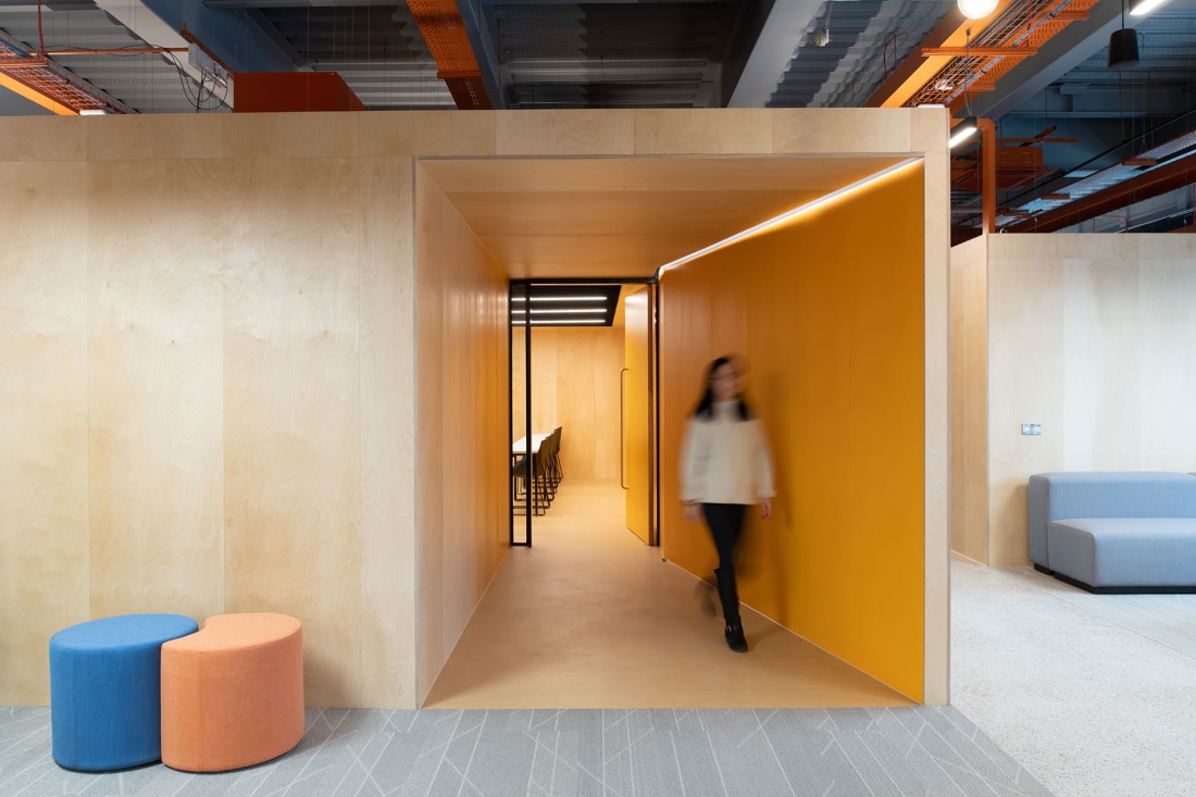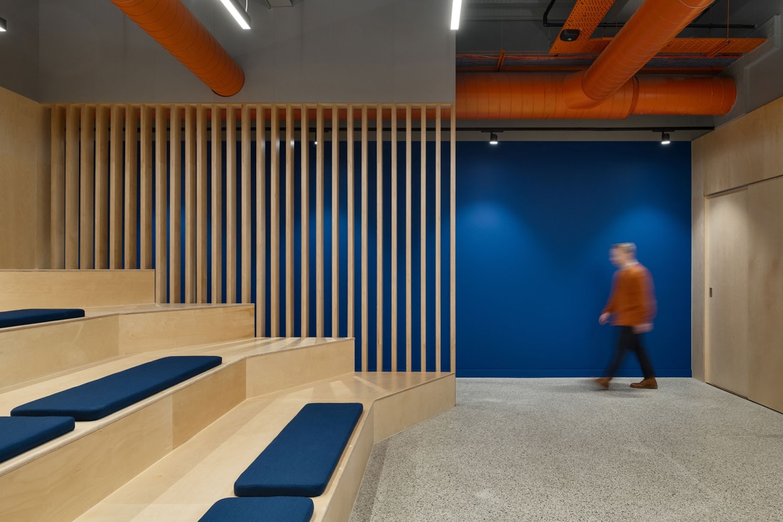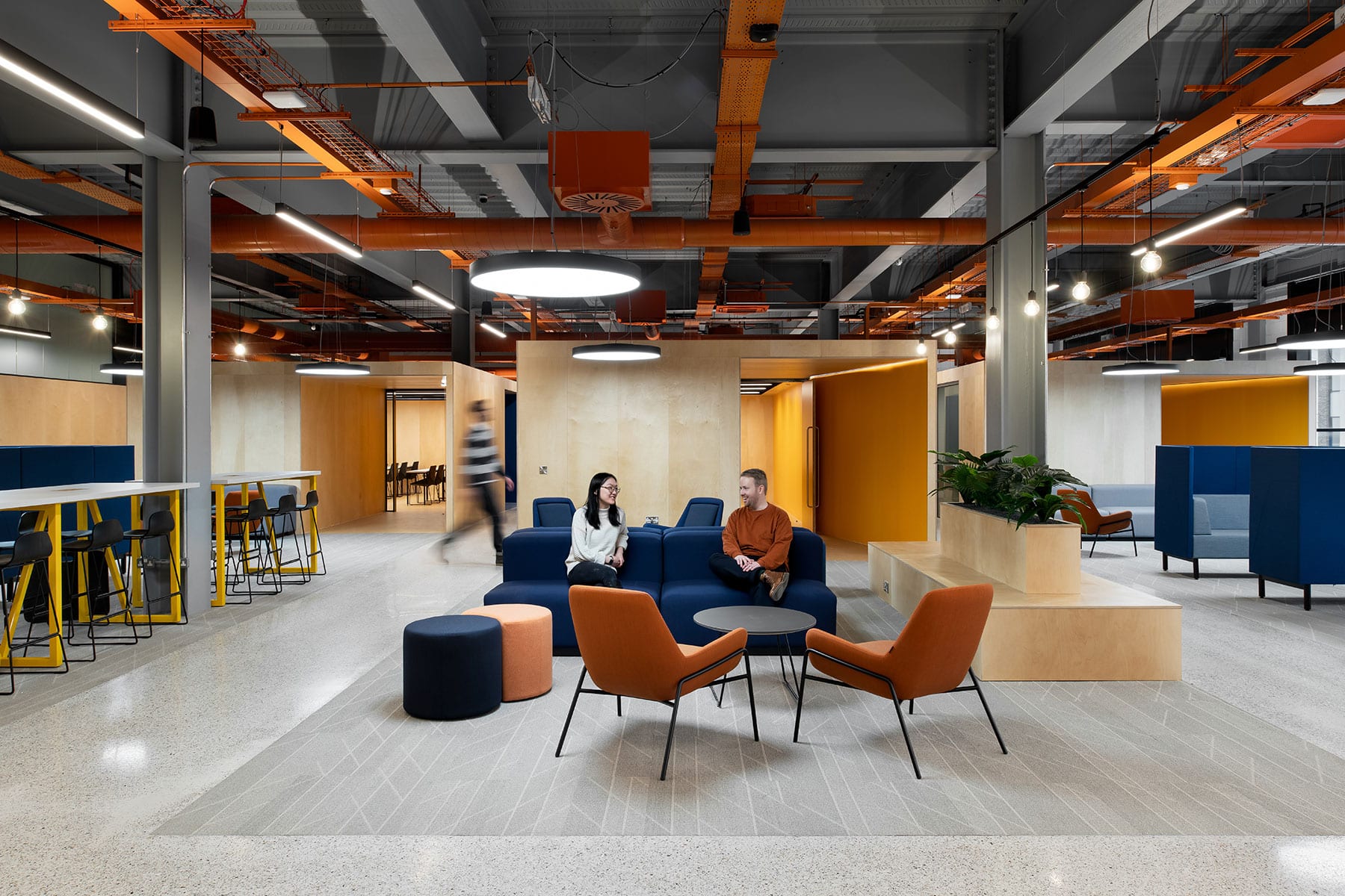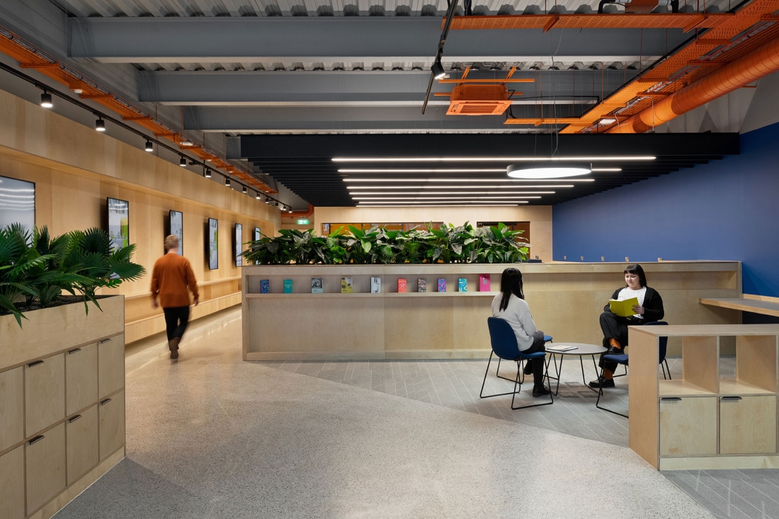 Using a mixture of digital screens, wayfinding and infographics the space will be both stimulating and visually engaging. Painted soffit, structure and services with contrasting lighting bring character and colour, whilst wall graphics provide an interior identity to the space. Joinery and furniture complete the vision, offering collaborative and private settings whilst providing a vibrant studying environment. The Welcome Area hosts informal soft lounge seating for students divided by joinery units displaying information about the university as well as providing advice and information as required.