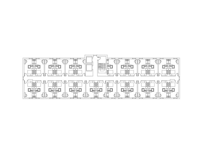 The typical plan has 28 studios accessed from a single core and central corridor. Corridors and lift lobbies have full height glazing to maximise daylight and views of the city centre. The studio, structural and façade modules coordinate to create a rational perimeter.