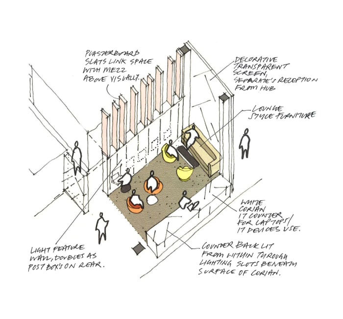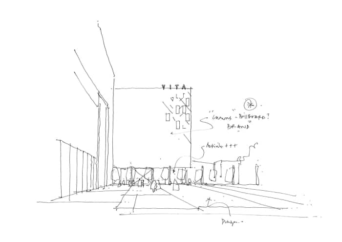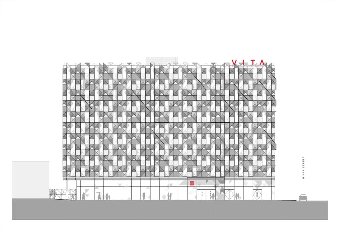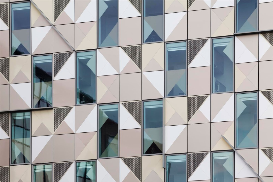 The façade references the strong linear and diagonal geometry of the VITA branding. The introduction of a diagonal element allows the highly repetitive internal arrangement to be camouflaged by a dynamic arrangement of geometric components. The materials are warm toned and harmonious with the adjacent context, contributing a distinctive character to establish First Street as a place. The appearance changes with the equally dynamic Manchester light and weather.